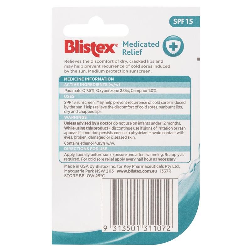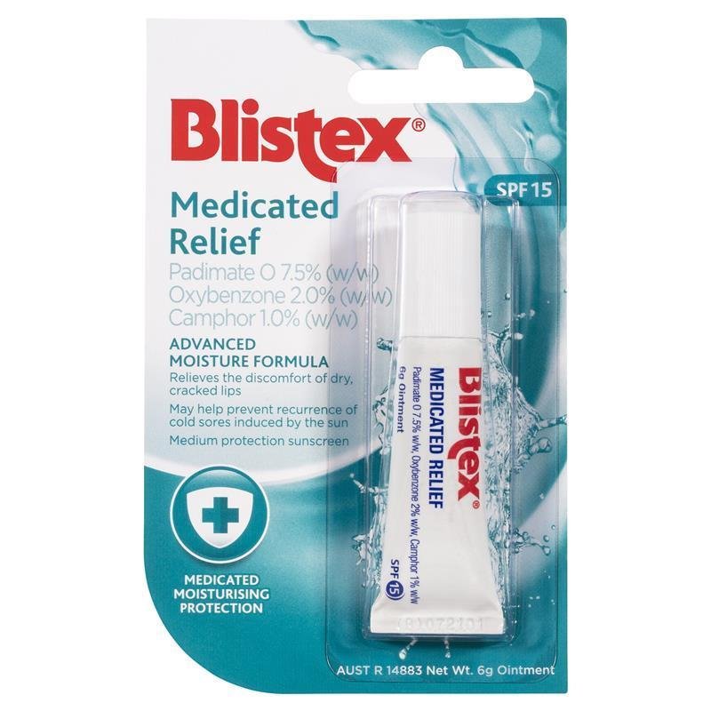 Blistex Medicated Relief helps to relieve the discomfort of cold sores, fever blisters, sunburnt and chapped lips. May also help to prevent the recurrence of sunlight-induced cold sore infections in susceptible persons. High protection sunscreen: SPF 15.