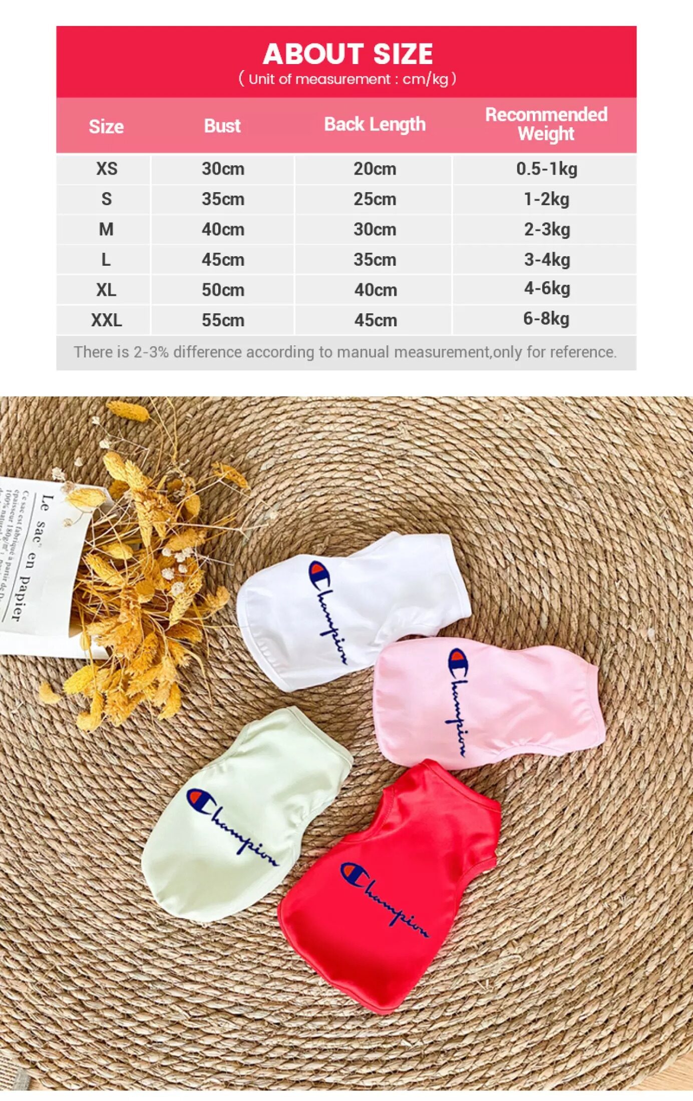 1.Pls kindly check your pet's measurements to make sure that the clothes fits pets before you order (1 Inch=2.54 Cm)