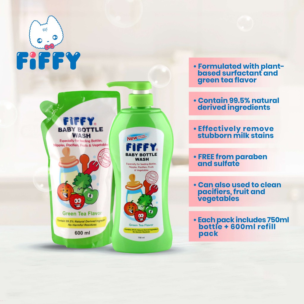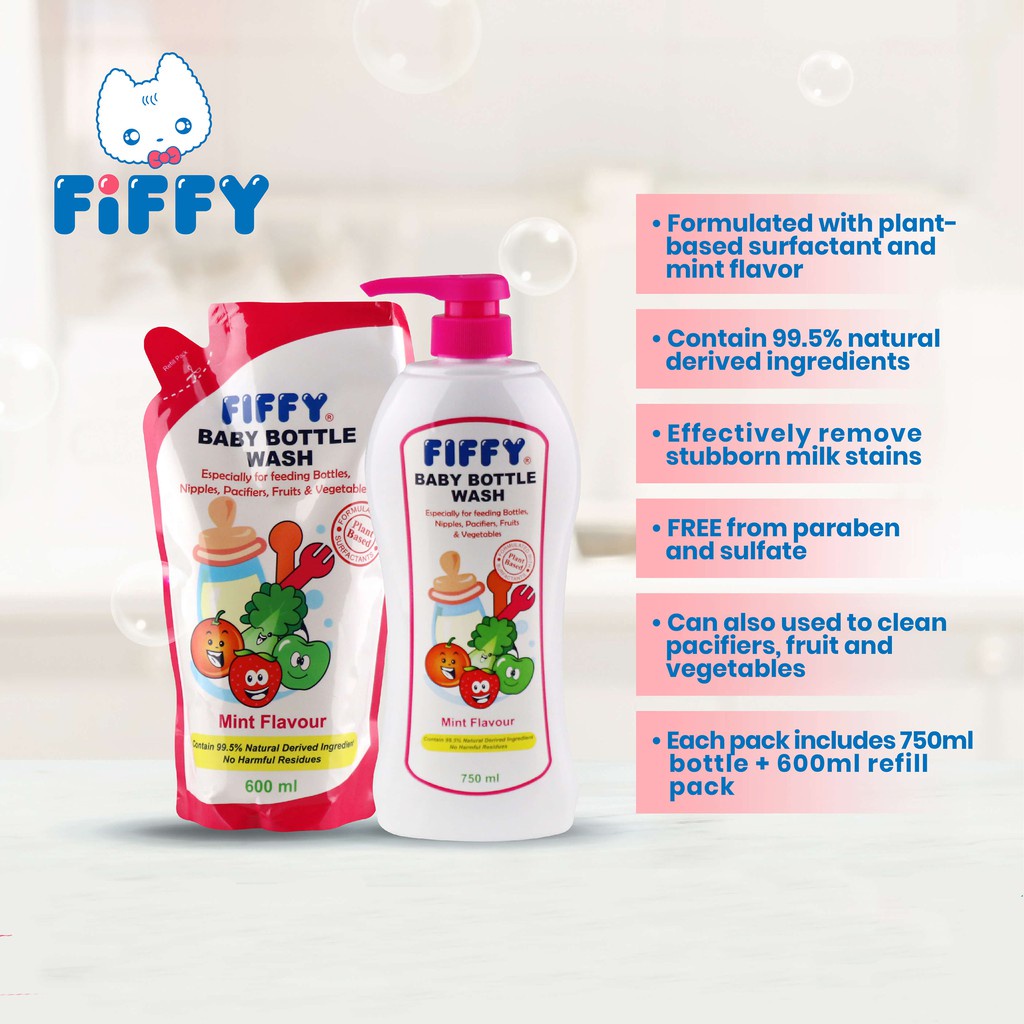 Refill pack for Fiffy bottle cleanser600mlContain 99.5% natural derived ingredientNo harmful residuesNo coloring & remove milk stain easilyParaben FREESulfate FREEEspecially for feeding bottles, nipples, pacifier, even fruits and vegetableMade in Malaysia