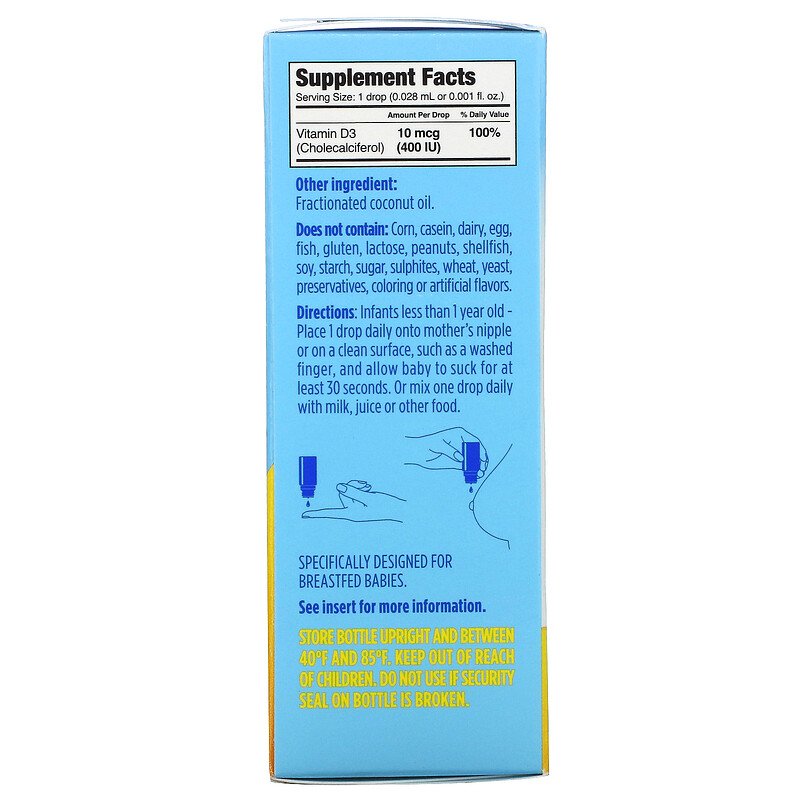 Infants less than 1 year old - Place 1 drop daily onto mother's nipple or on a clean surface, such as a washed finger, and allow baby to suck for at least 30 seconds. Or mix one drop daily with milk, juice or other food.