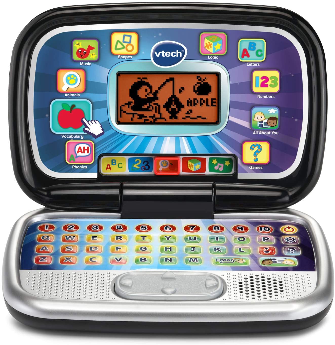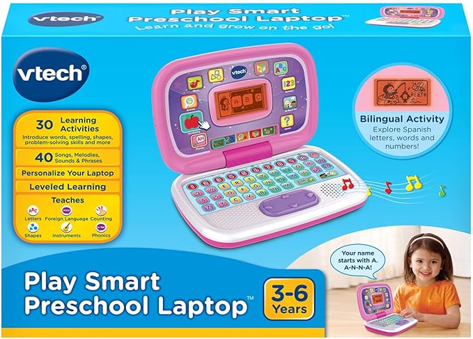 - Sleek, black toy laptop like Mom and Dad's has 30 learning activites with leveled learning. Personalize it with your child's name, age, avatar and more