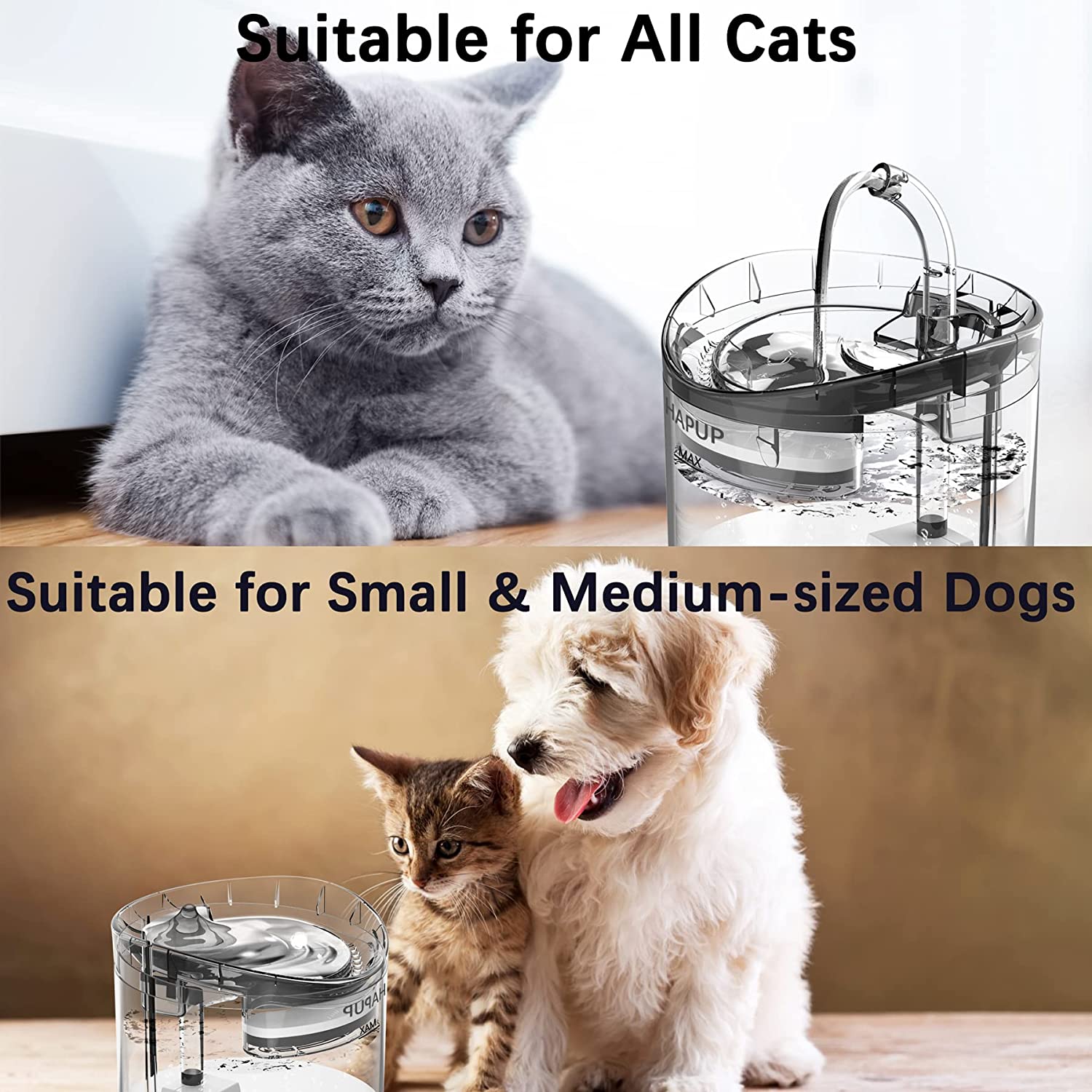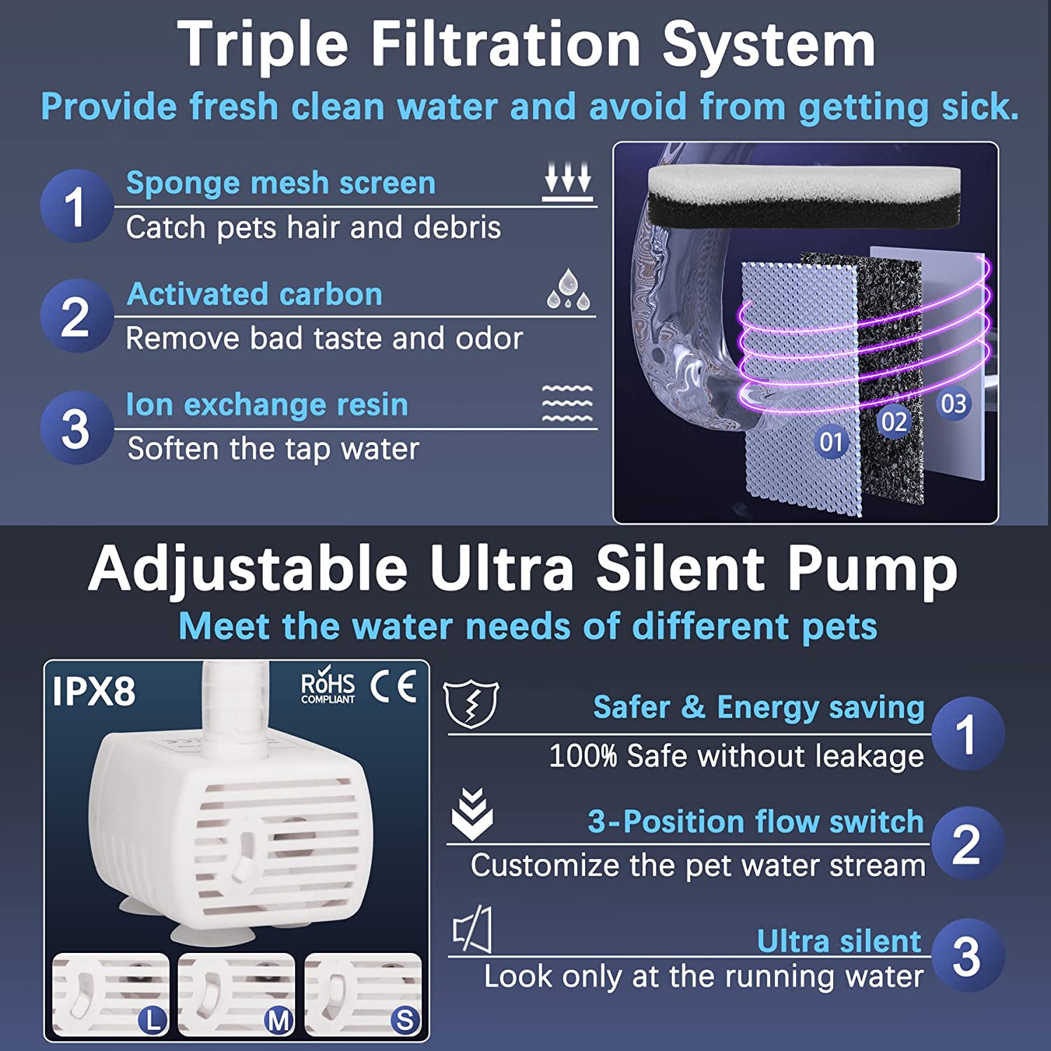 The filtration system uses activated replaceable carbons filters to remove chlorine heavy metals, filter hair residue and food particles left by your pets to improve water taste and keep it clean and fresh.