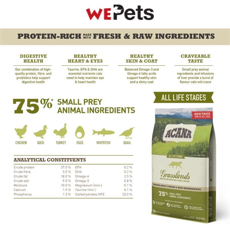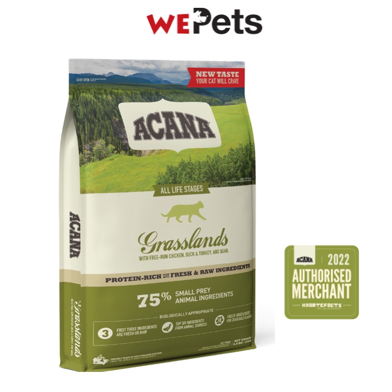 Cats require a diet rich in animal protein. Inspired by our vast grasslands and cold northern lakes, ACANA Grasslands is brimming with free-run chicken, turkey, and duck, cage-free eggs, and wild-caught fish, in WholePrey ratios of meat, organs, cartilage, and bone. Our ingredients are delivered to our kitchen fresh or raw by people we know and trust, giving your cat the best ingredients and a recipe that will keep them happy, healthy, and strong.