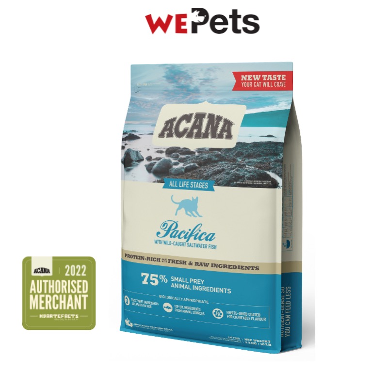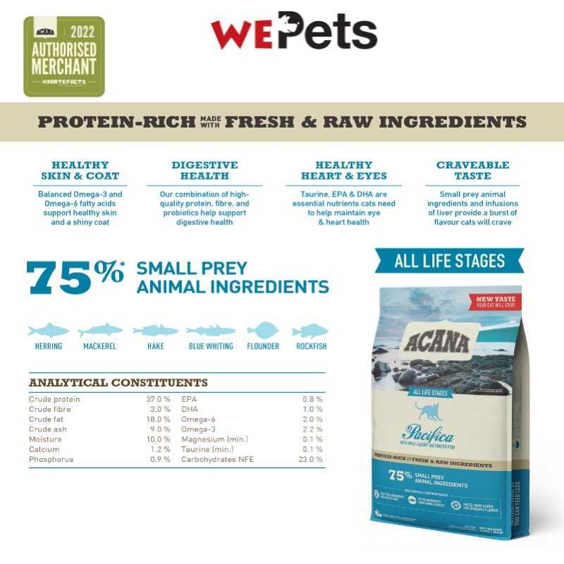Bursting with wild-caught herring, mackerel, flounder, hake, and rockfish in WholePrey ratios of fish, organs, and bone, ACANA Pacifica naturally delivers the nutrients your cat requires for peak health, nourishing them the way Mother Nature intended.