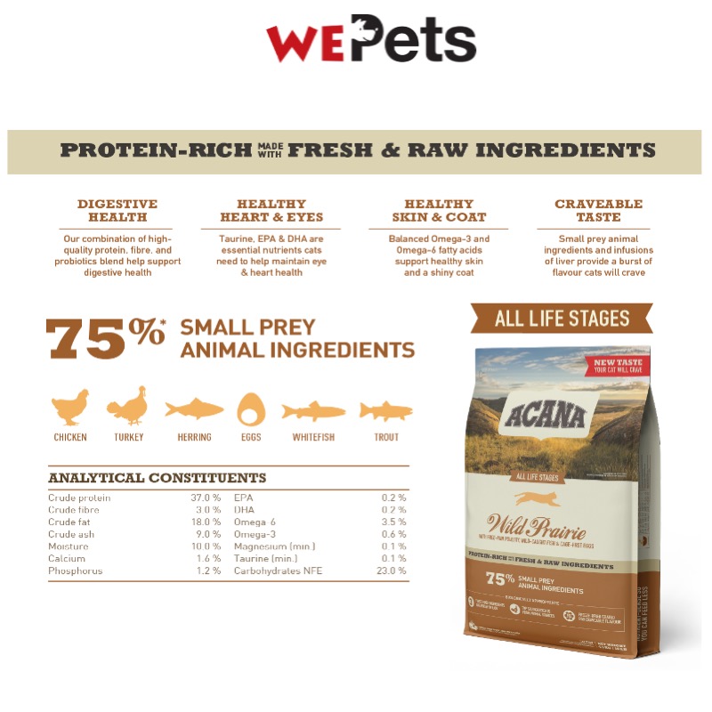 FOR ALL BREEDS AND LIFE STAGESInspired by our vast fertile prairies, rich soils and pristine lakes, ACANA Wild Prairie features unique regional ingredients delivered fresh from western Canadian farms and waters.Loaded with free-run chicken, turkey, whole nest-laid eggs and wild-caught fish from our cold northern lakes, delivered fresh daily in WholePrey™ ratios, ACANA Wild Prairie is brimming with natural goodness.