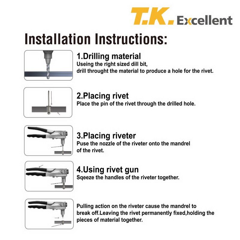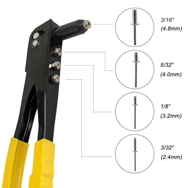You have everything you need to start using this remarkable tool immediately. Can handle just about any of the most common sizes of plastic and metal for sturdy, reliable rivet fasteners. Blind rivets can be used for different purposes at home and workplace. These fasteners attach metal sheets together so easily and effectively. The rivet body is made of aluminum, which length 235mm. Assembly applications include office furniture, mobile homes, public transportation, plastic components, electrical engineering, and lighting. Specially designed tool is used to draw the mandrel into the rivet. Used to secure two or more components together. This set includes one tacklife hand riveter comes with, wrench store in handle and four mounted nosepieces, in 3/32"(2.4mm), 1/8"(3.2mm), 5/32"(4.0mm) and 3/16"(4.8mm). Also have two size of aluminum dome blind rivets: 3.2*10mm and 4.0*13.5mm.