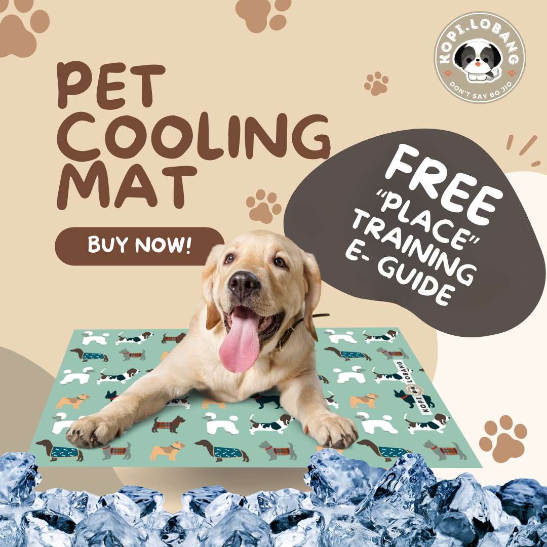 FREE "Place" Training e-Guide, exclusively produced by Kopi.Lobang, to train your dog to go to their Cooling Mat & relax