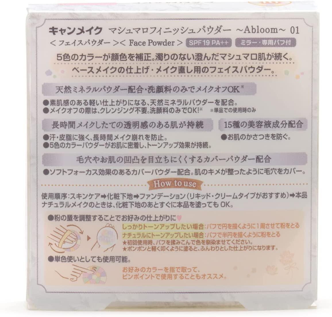 A face powder with five colors to tone up your complexion and give you long-lasting and clear, soft marshmallow-like skin! It is resistant to perspiration and sebum, and resists makeup breakdown. It also contains 15 kinds of beauty essence ingredients to prevent skin from becoming dry and flaky. This powder is also SPF19/PA++ to help protect your skin from everyday UV rays, and when used alone, it can be removed with a cleanser or soap only! The finish can be adjusted depending on the amount applied, and pinpointing a single color is also recommended for a unique look ♡