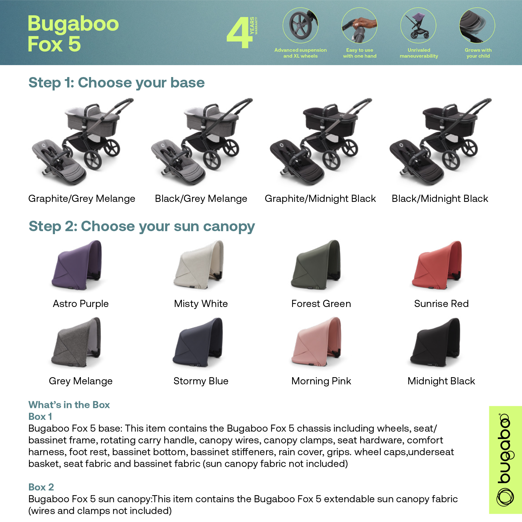 Our most comfortable and maneuverable all-terrain stroller. The Bugaboo Fox 5 offers the best ride on any terrain, with one-hand fold and superior comfort for your child.