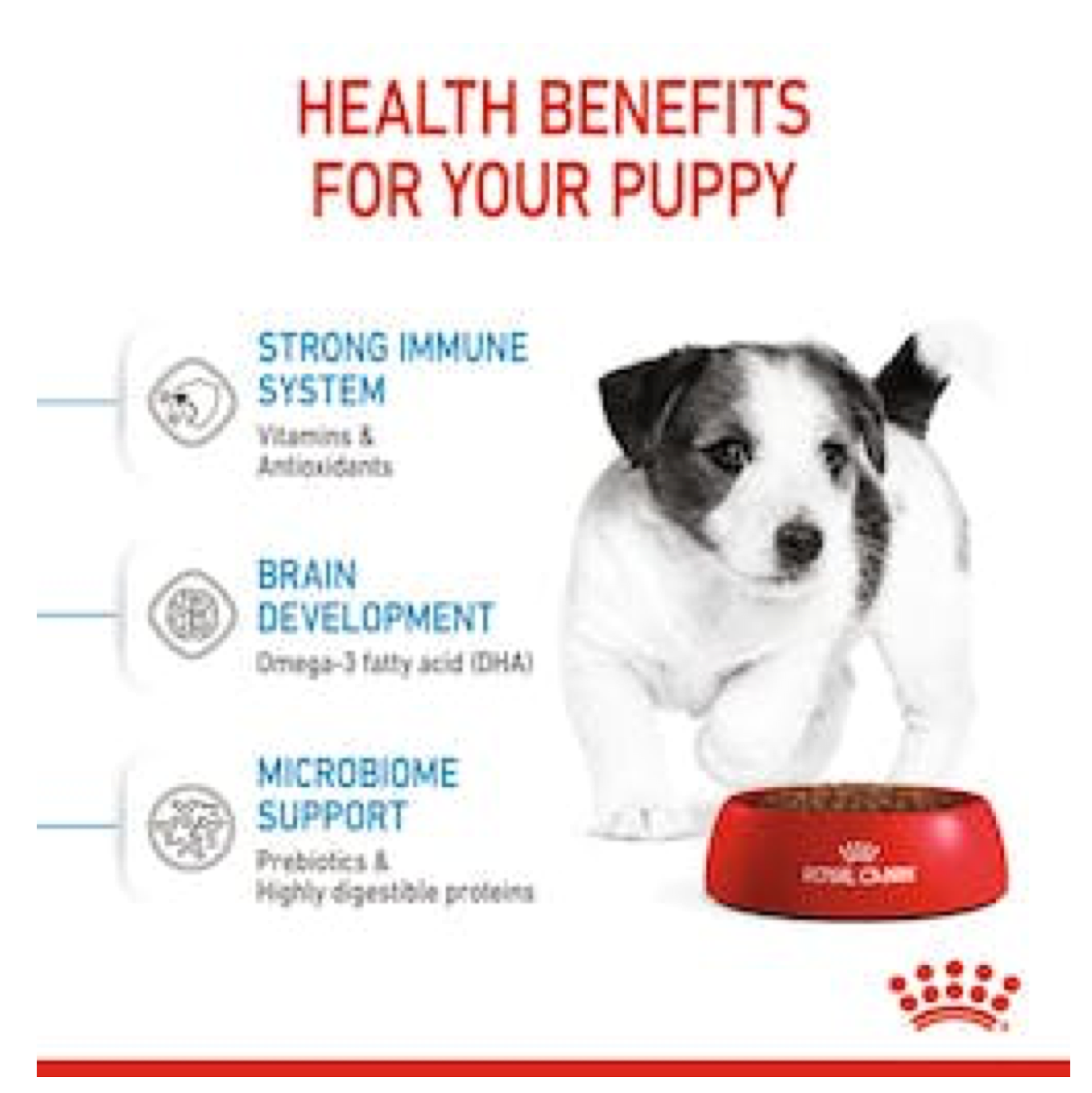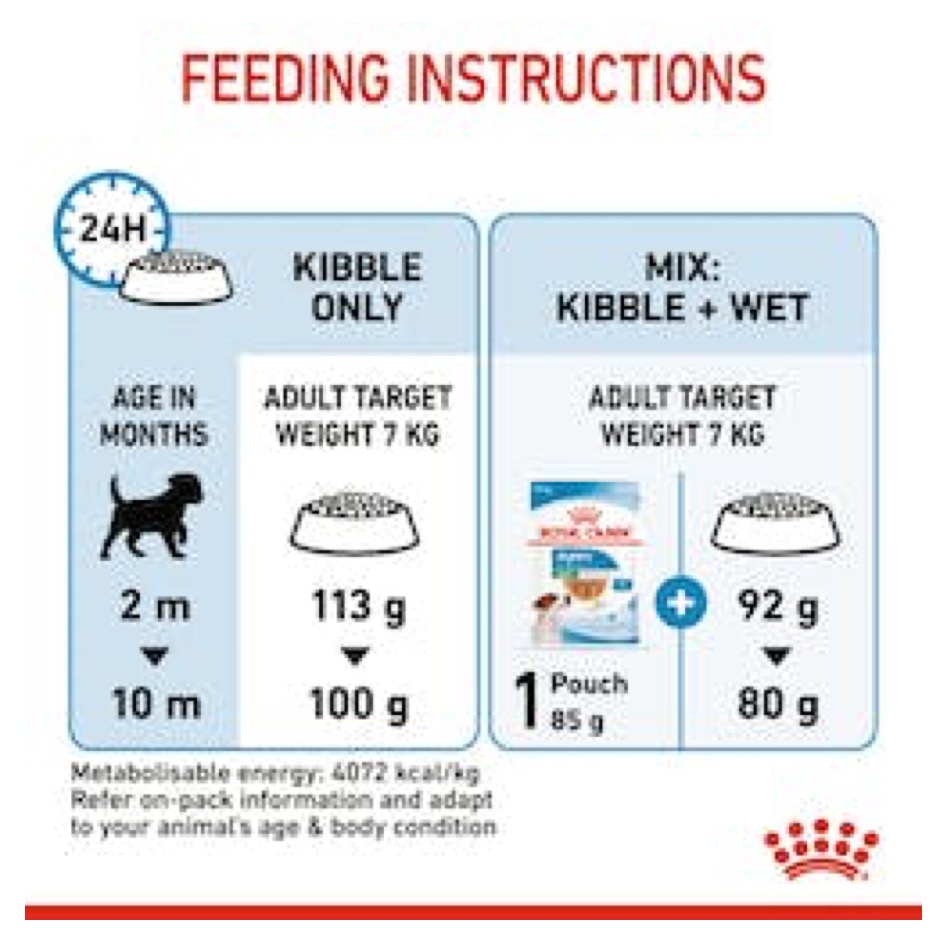Complete feed for dogs - For small breed puppies (adult weight up to 10 kg) - Up to 10 months. ROYAL CANIN® Mini Puppy is specially formulated to support the nutritional needs of small breed puppies. This formula is suitable for 2 to 10-month-old puppies that should reach an adult weight of 4-10 kg.