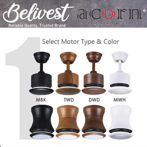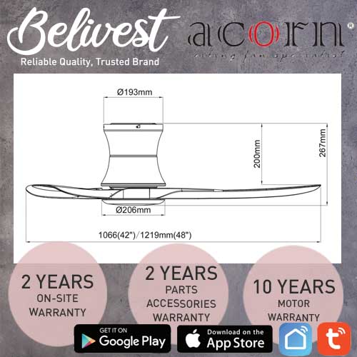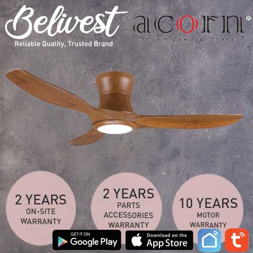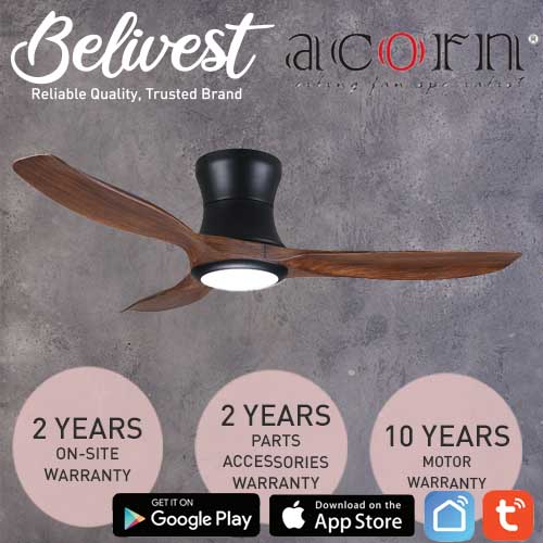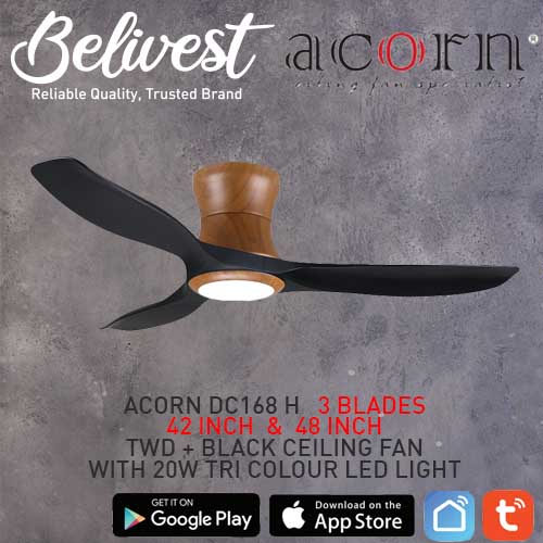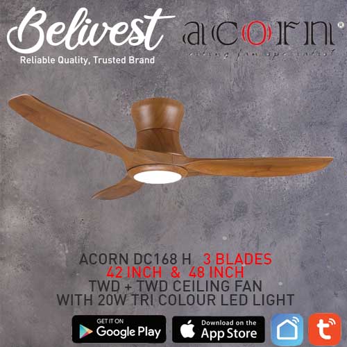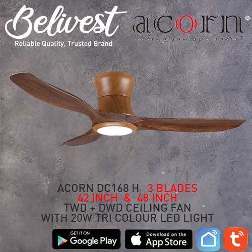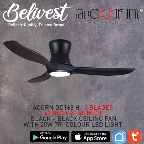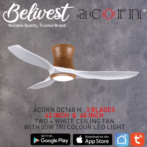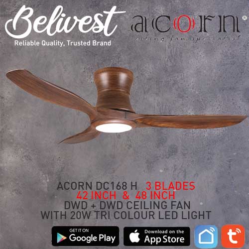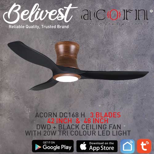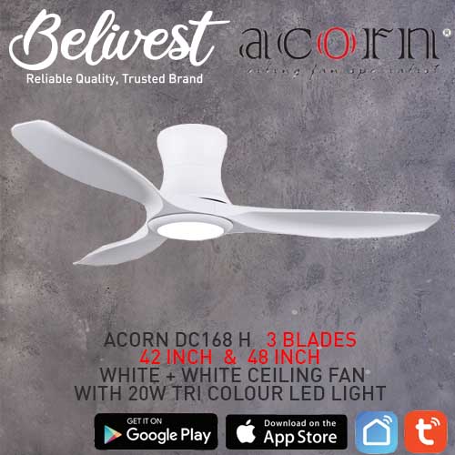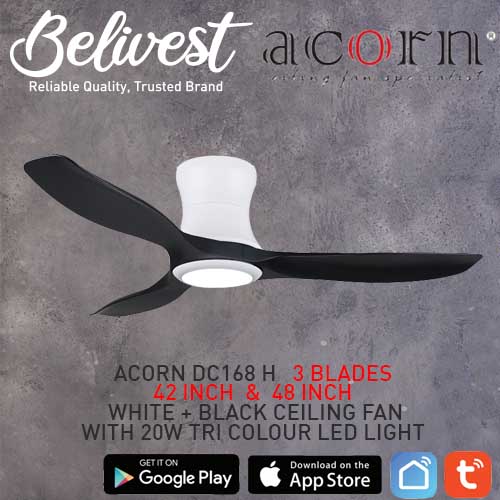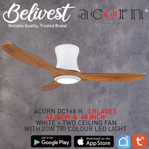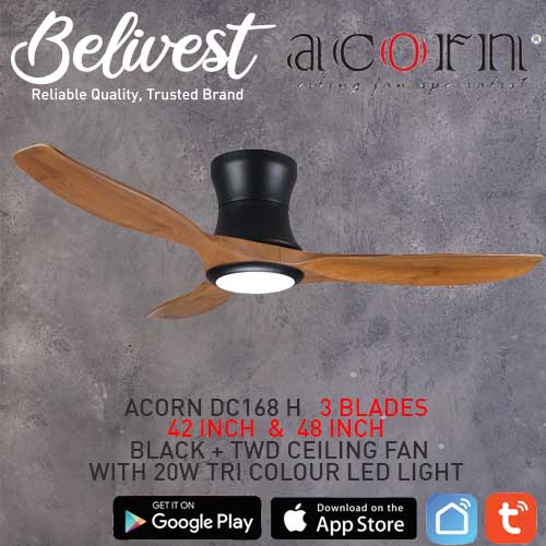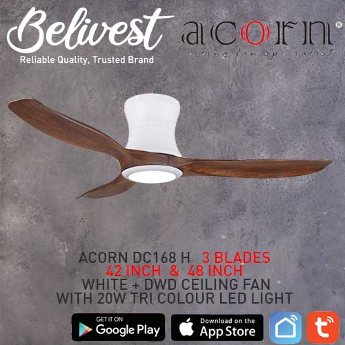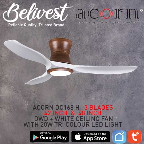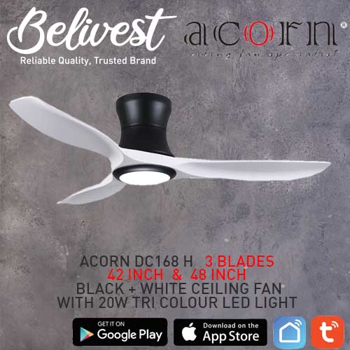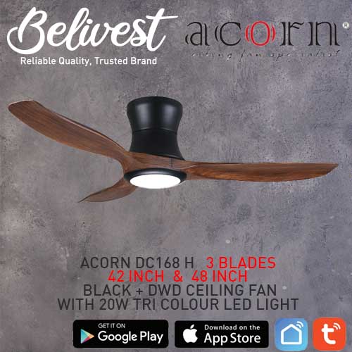 (PRICE GUARANTEED) Acorn DC-168 HUGGER SMART Ceiling Fan - 3 Blades 42,48 Inch - White/Black/Wood - With/Without 20W LED - google home, amazon alexa, tuya smart life