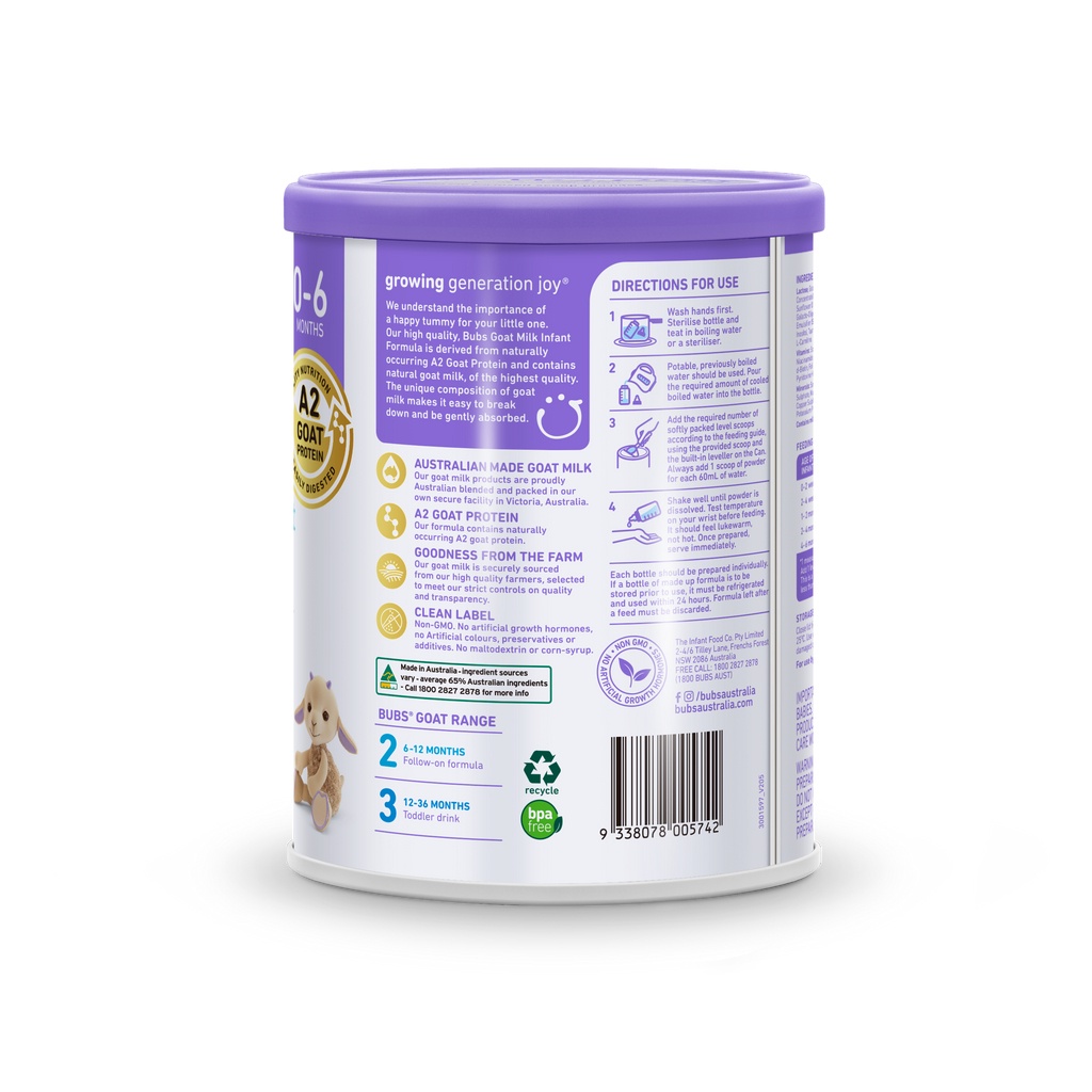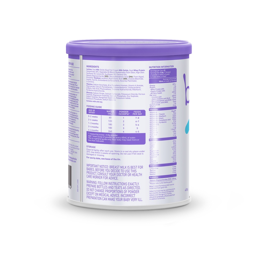 Bubs Goat Milk Stage 1 Formula is exclusively formulated for tiny tummies aged 0 to 6 months.