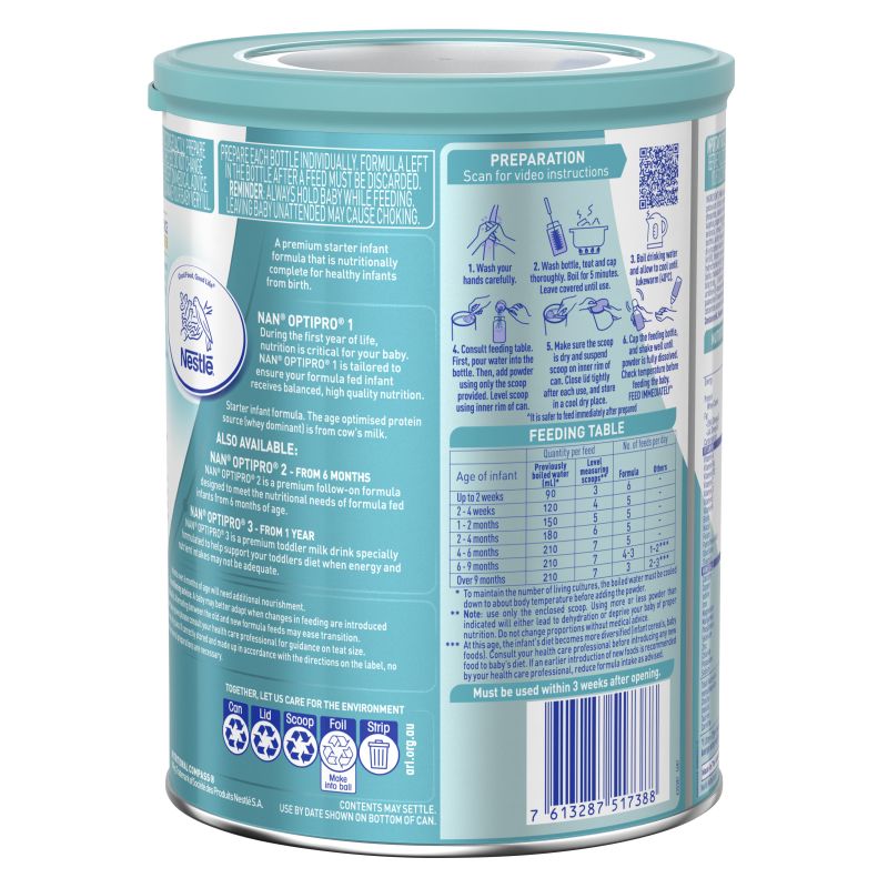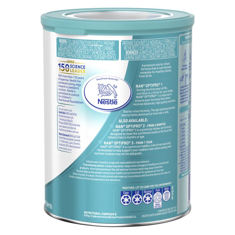 ******* ships out in 48 hours ****** Expiry date: 10 August 2024 Made in Netherlands for Nestle Australia ** Important Notice: Breast milk is the best for babies. The World Health recommends exclusive breastfeeding for the first six months of life. Unnecessary introduction of bottle feeding or other food and drinks will have a negative impact on breastfeeding. After six months of age, infants should receive age breastfeeding continues for up to two years of age or beyond. Consult appropriate foods while your doctor before deciding to use infant formula or if you have difficulty breastfeeding. When it comes to babies, breastfeeding is best, and provides the ideal balanced diet and protection against illness. During pregnancy and after delivery, a mother's diet should contain sufficient key nutrients. Professional guidance can be sought on diet and the preparation for and maintenance of breastfeeding. Infant formula is intended to replace breast-milk when mothers do not breastfeed. A decision not to breast-feed, or to introduce partial bottle-feeding, could reduce the supply of breast-milk. Once reduced, it is difficult to re-establish. Infant formula should be prepared and used as directed. Unnecessary or improper use, such as the use of unboiled water, unboiled bottles or incorrect dilution may present a health hazard. Social and financial implications, such as the preparation requirements and the cost of providing formula until 12 months of age, should be considered when choosing how to feed infants. NAN OPTIPRO 1 is a premium starter infant formula that is specially designed to help ensure your formula fed infant receives balanced, high quality nutrition. NAN OPTIPRO 1 is nutritionally complete for healthy infants from birth.