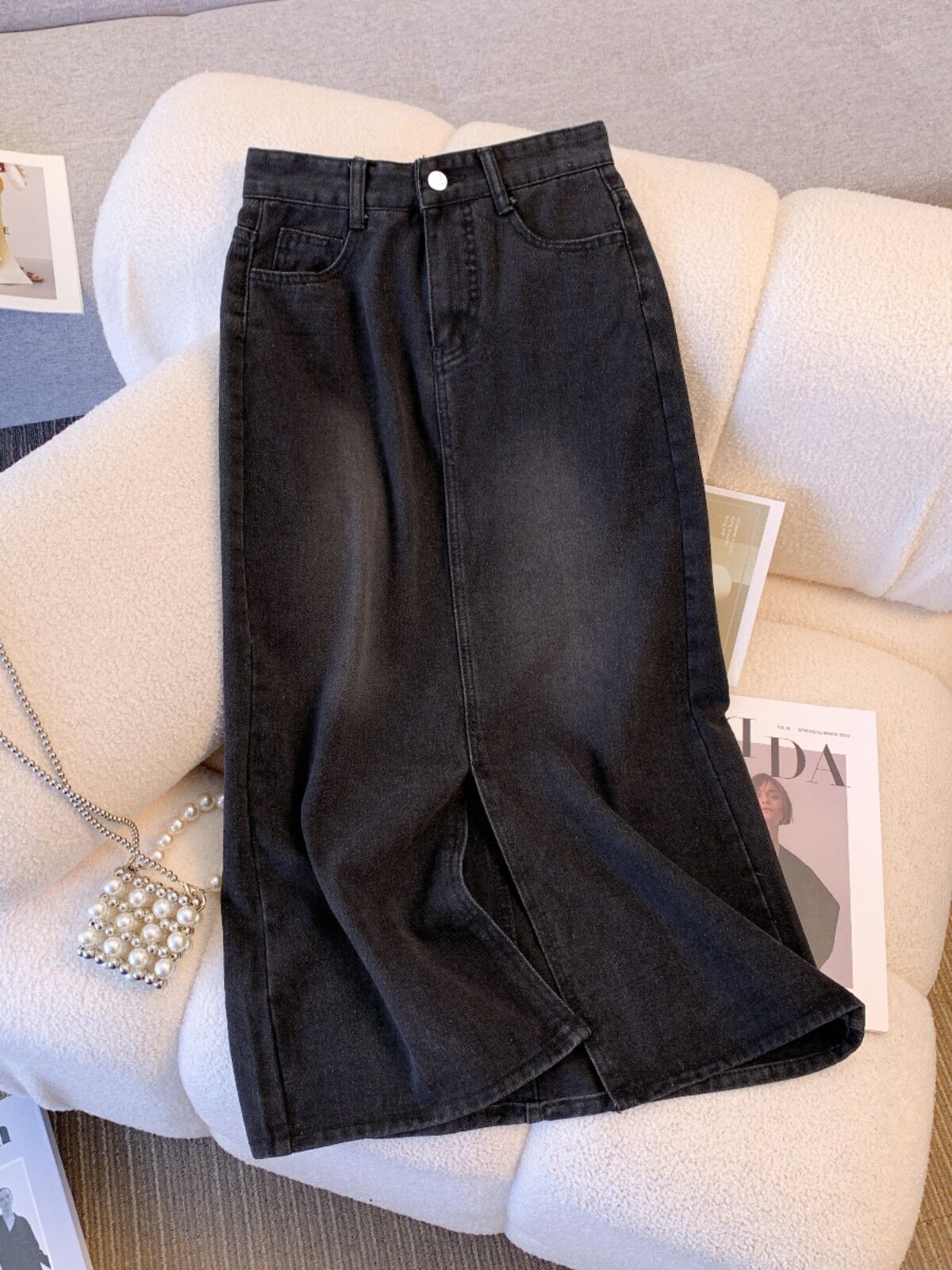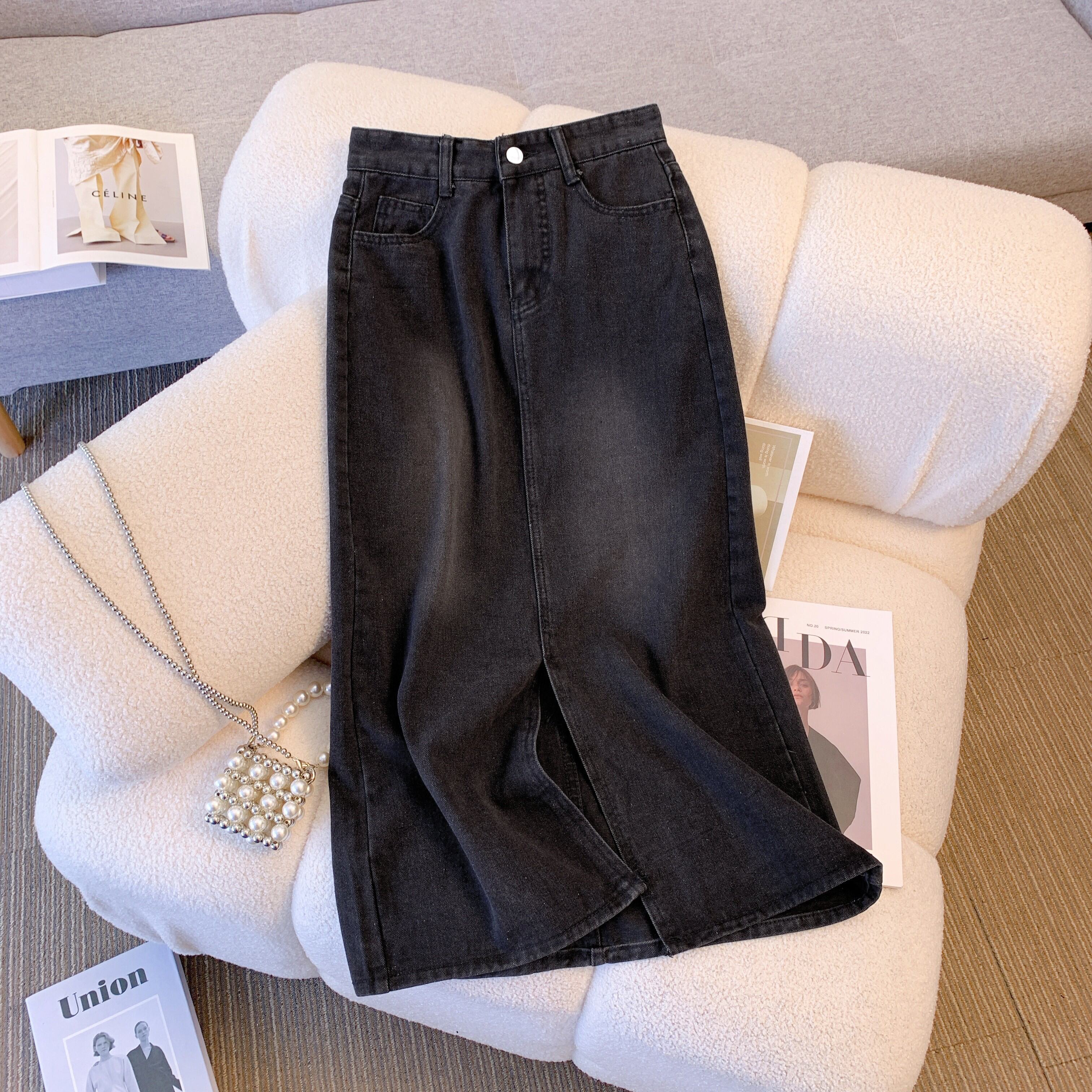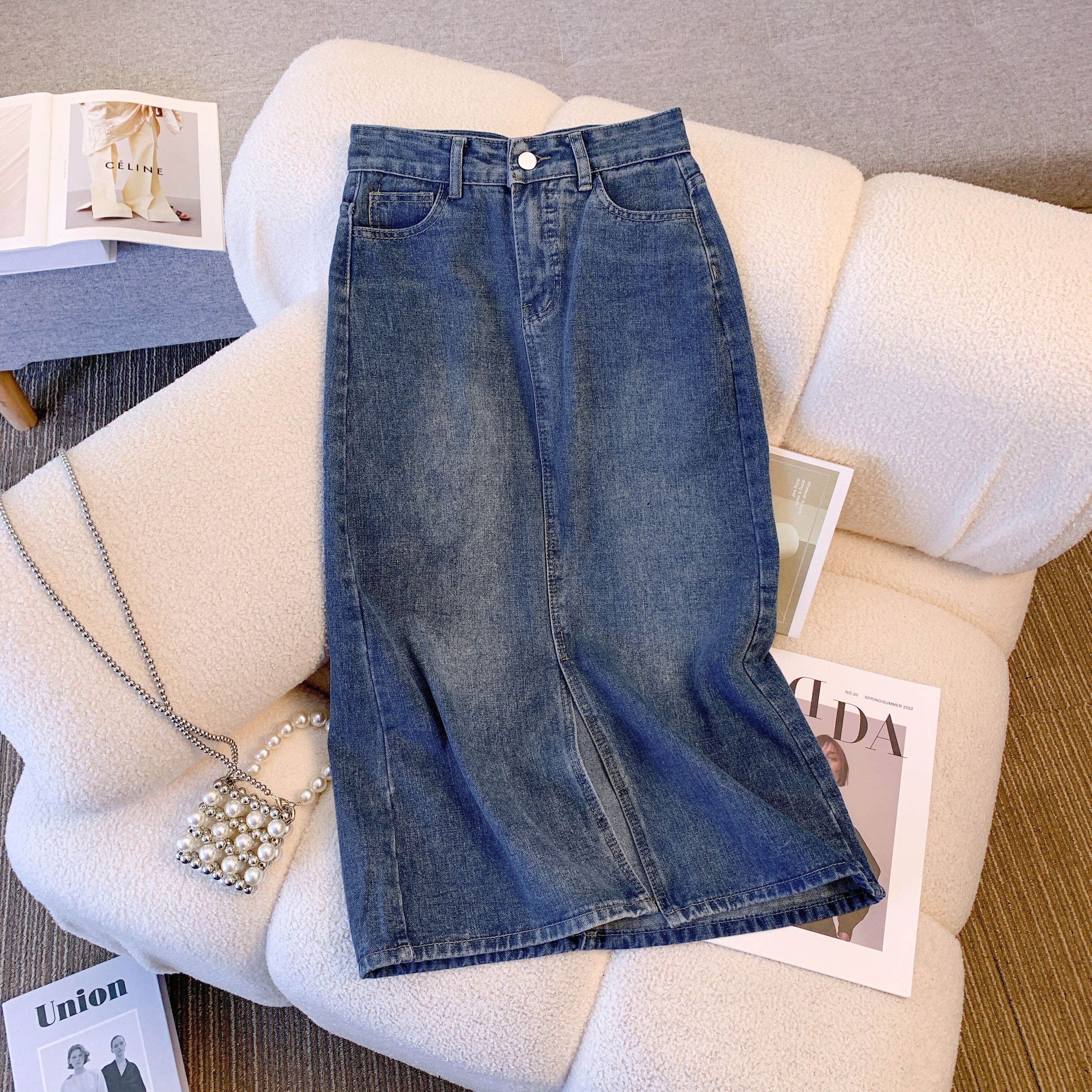 Retro Washed Split Denim Skirt Women's Autumn Clothing Mid Length Long Length High Waist A- line Skirt Short Slim Looking Bodycon Dress