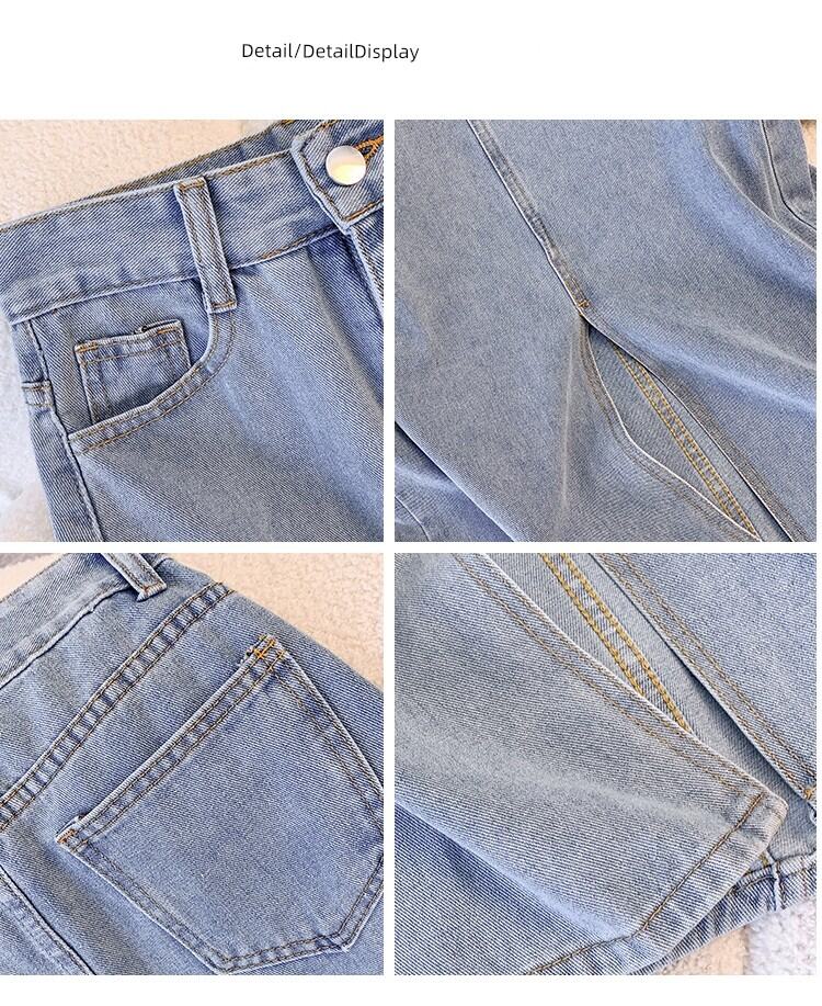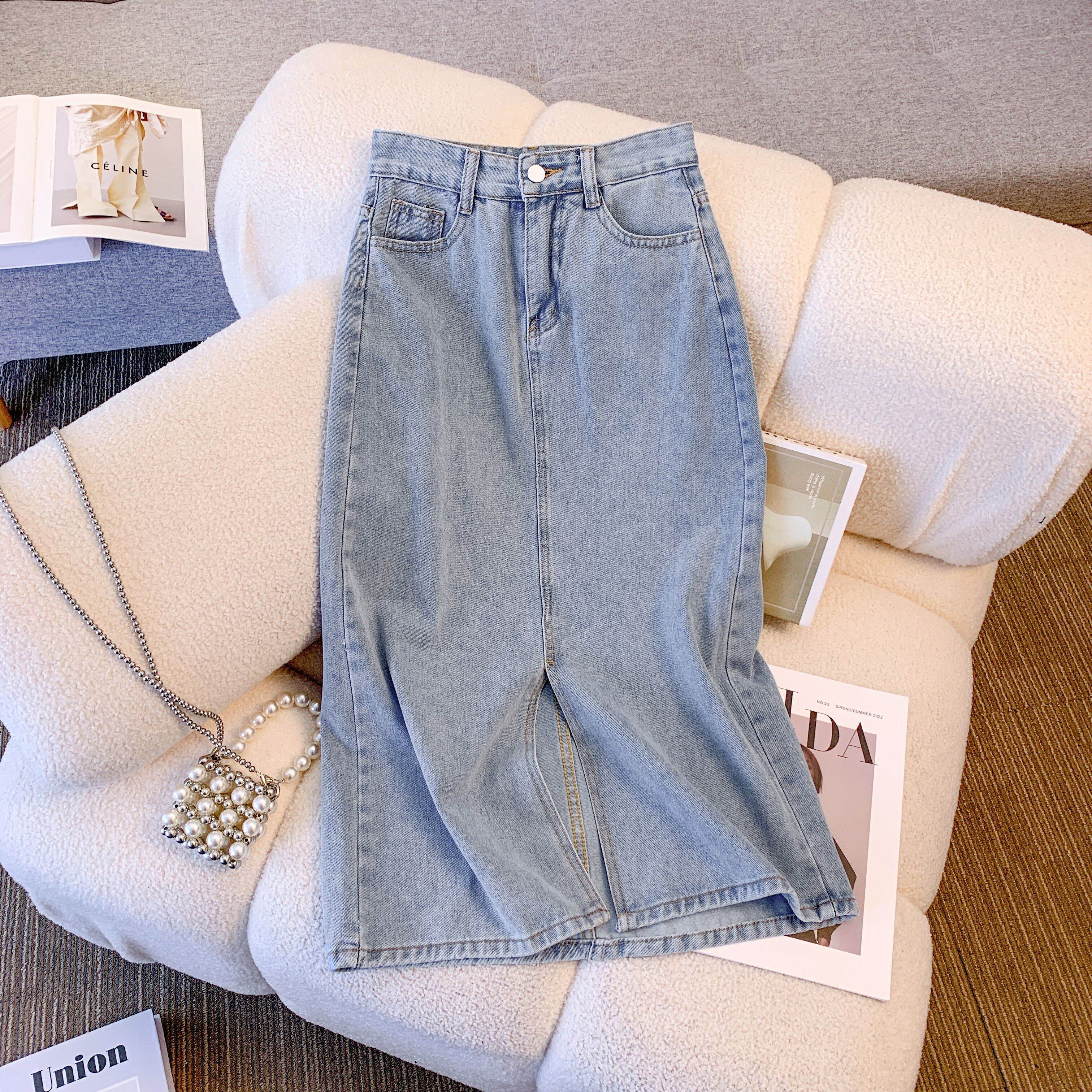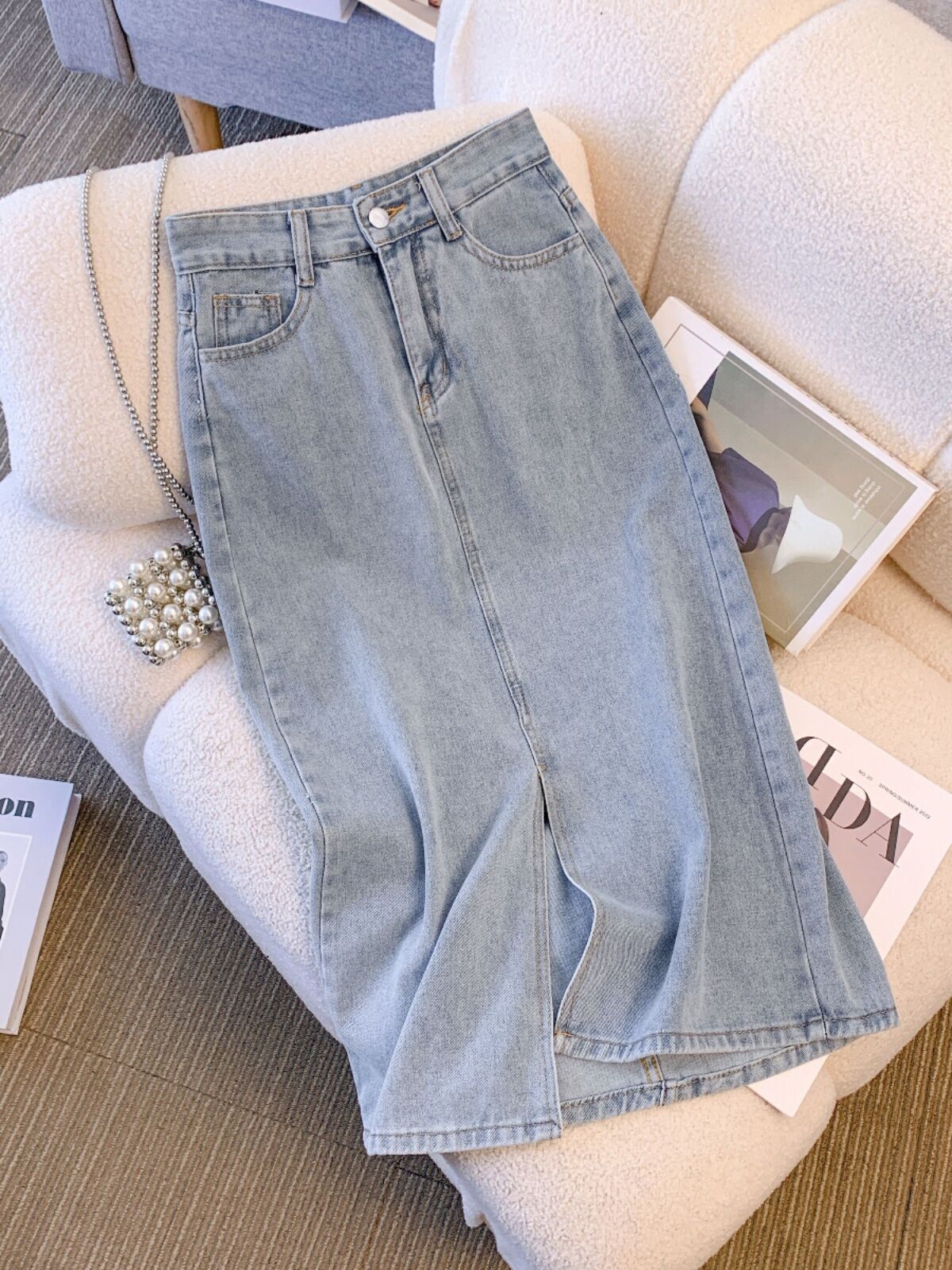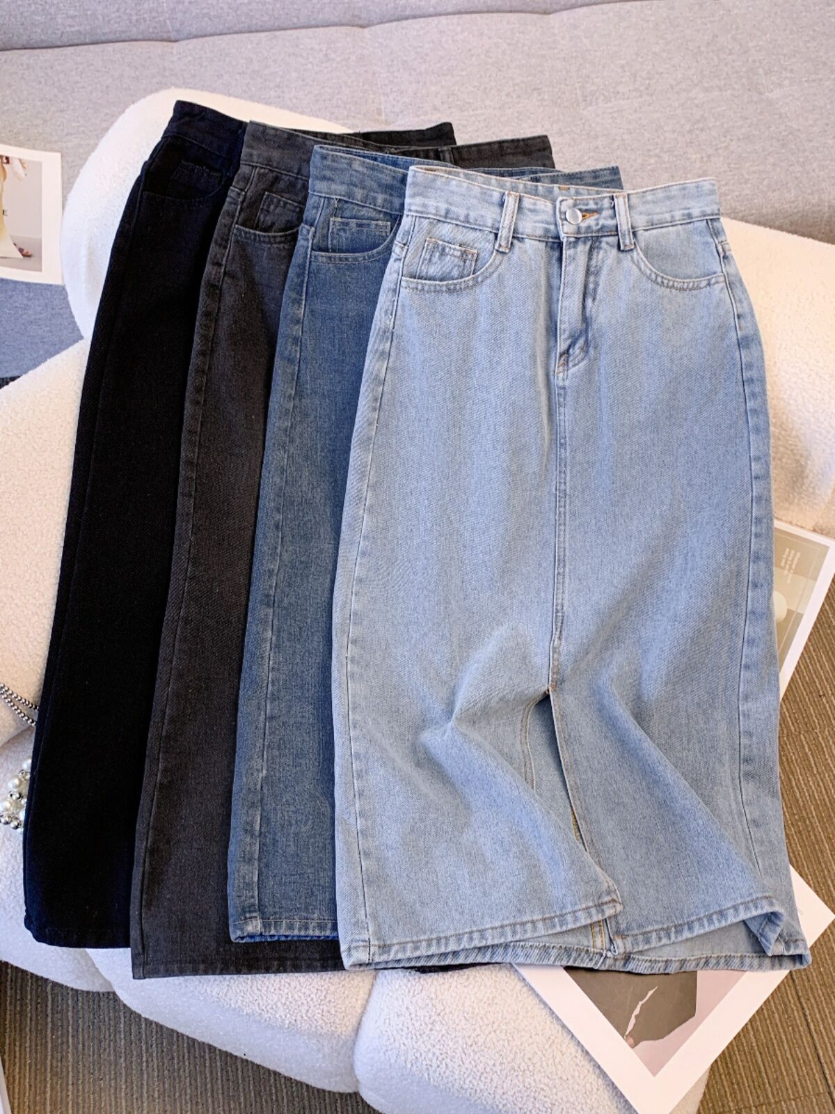 Retro Washed Split Denim Skirt Women's Autumn Clothing Mid Length Long Length High Waist A- line Skirt Short Slim Looking Bodycon Dress