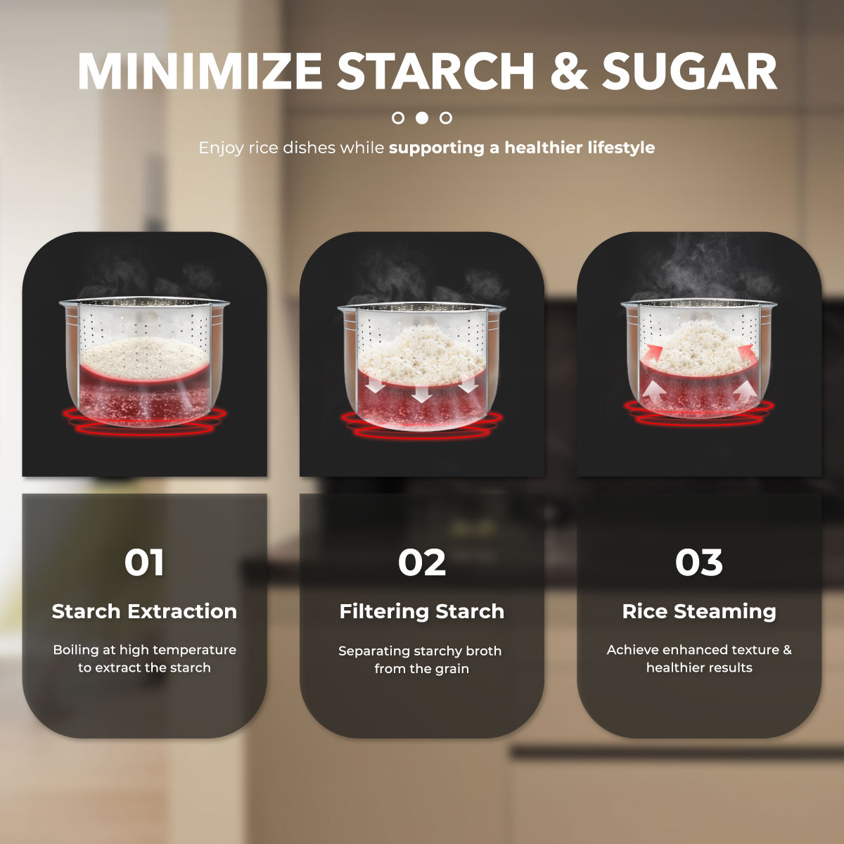 ? All-new Sugar Reducing technology minimizes starches in your rice without sacrificing flavour and texture