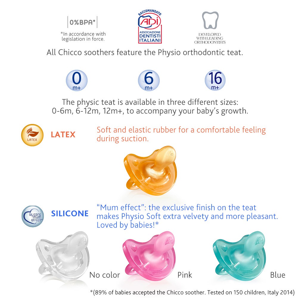 •Natural Latex Physio Soft Soother is made of natural latex rubber, a material that is soft, elastic and resistant.