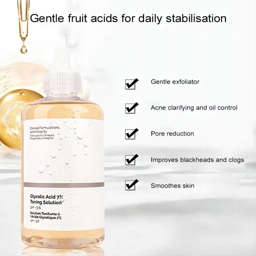 Glycolic Acid is an alpha hydroxy acid that exfoliates the skin. This 7% toning solution offers mild exfoliation for improved skin radiance and visible clarity. The formula also improves the appearance of skin texture with continued use.