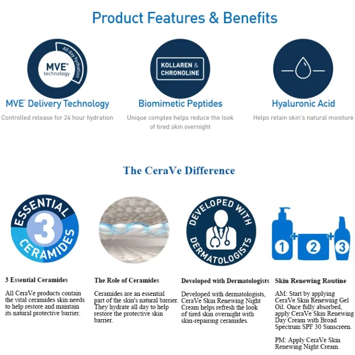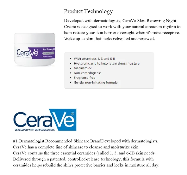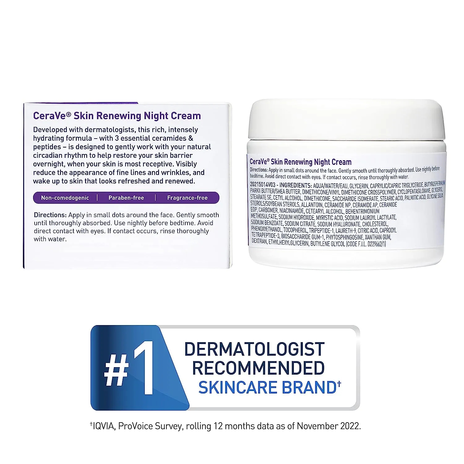 Developed with dermatologists, CeraVe Skin Renewing Night Cream is designed to work with your natura circadian rhythm to help restore your skin barrier overnight when it's most receptive. Wake up to skin that looks refreshed and renewed.