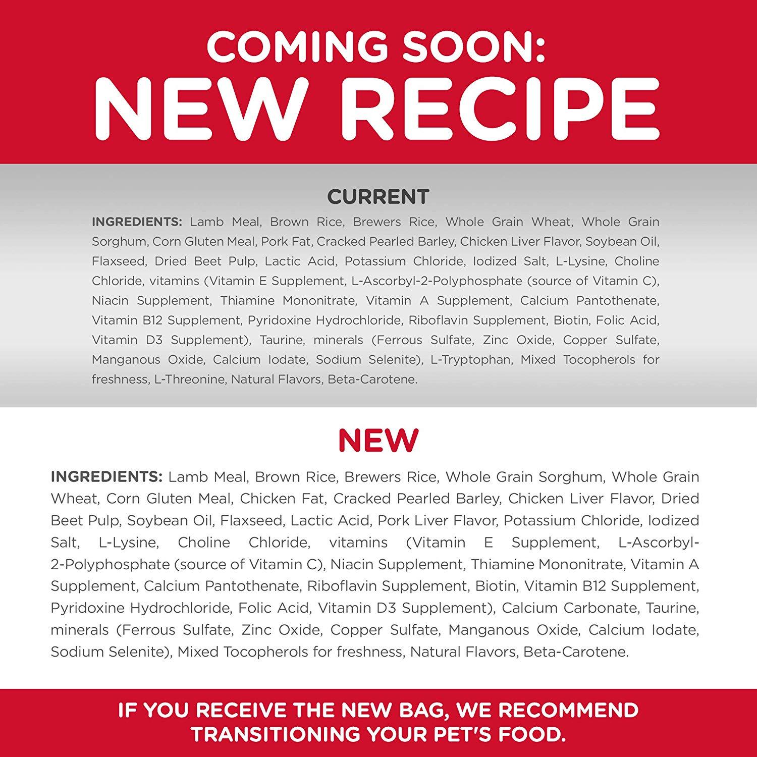 Lamb Meal, Brown Rice, Brewers Rice, Whole Grain Sorghum, Whole Grain Wheat, Corn Gluten Meal, Chicken Fat, Cracked Pearled Barley, Chicken Liver Flavor, Dried Beet Pulp, Soybean Oil, Flaxseed, Lactic Acid, Pork Liver Flavor, Potassium Chloride, Iodized Salt, L-Lysine, Choline Chloride, vitamins (Vitamin E Supplement, L-Ascorbyl-2-Polyphosphate (source of Vitamin C), Niacin Supplement, Thiamine Mononitrate, Vitamin A Supplement, Calcium Pantothenate, Riboflavin Supplement, Biotin, Vitamin B12 Supplement, Pyridoxine Hydrochloride, Folic Acid, Vitamin D3 Supplement), Calcium Carbonate, Taurine, minerals (Ferrous Sulfate, Zinc Oxide, Copper Sulfate, Manganous Oxide, Calcium Iodate, Sodium Selenite), Mixed Tocopherols for freshness, Natural Flavors, Beta-Carotene.