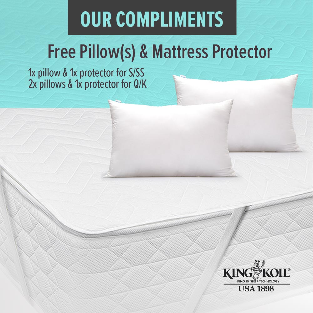 Complimentary items: King Koil Luxury Hollow Fibre Pillow (1pc for Single/Super Single Mattress, 2pcs for Queen/King Mattress) and King Koil Basic Waterproof Mattress Protector (1pc in corresponding size)