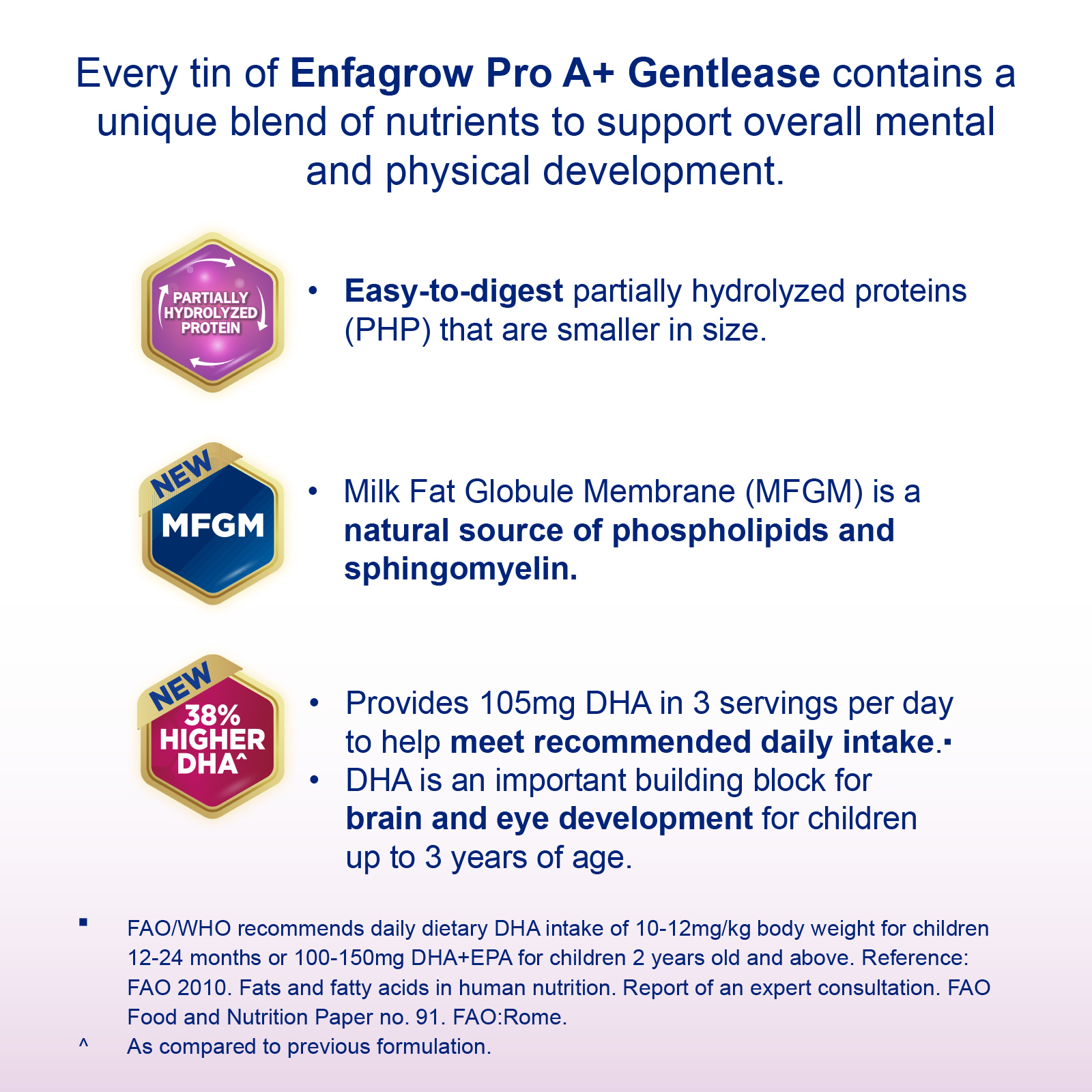 With over 100 years of experience in pediatric nutrition, Mead Johnson Nutrition has scientifically formulated the all-new Enfagrow Pro A+ Gentlease with a unique blend of nutrients that are important for overall mental and physical development.