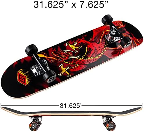 Width 7.625" / Length 31.625" / Wheelbase 13.75"    SIZED FOR SMALLER RIDERS - Powell Golden Dragon complete skateboards provide a high quality at an entry level price. They are the perfect first skateboard for beginners and a smart choice for price conscious advanced skaters.    BACKED BY STEVE CABALLERO - "I believe these birch skateboards are perfect for beginners. You can't beat the quality and price."    TRUSTED NAME IN SKATEBOARDS - All Powell-Peralta products come with a warranty against manufacturer defects    Powell Golden Dragon complete skateboards provide a high quality at an entry level price. They are the perfect first skateboard for beginners and a smart choice for price conscious advanced skaters. Powell Golden Dragon skateboards are created in a Chinese factory that uses our AirLam presses and glue supplier. The resulting deck is the best produced in Asia and we stand behind this skateboard with confidence.