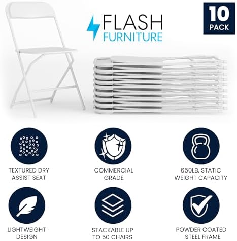 Set of 10 lightweight plastic folding chairs provide commercial-grade, on-demand seating solutions; foldable stack chairs are a smart investment for business and home usage    Can be nested or stacked for easy storage, transport, post event cleanup or for routine floor maintenance    Integrated drain holes alleviate pooling from spills or rainwater; floor caps won't leave marks and prevent damage to hard flooring surfaces    Double support braces combined with an 18 gauge steel frame and textured seat for a stable worry-free seating experience    PRODUCT MEASUREMENTS : Overall Size: 17.5"W x 18"D x 31.5"H; Folded Size: 17.5"W x 2.5"D x 38.25"H; Seat Size: 15.5"W x 15.5"D x 17.75"H; Back Size: 17.5"W x 15.5"H; No Assembly Required