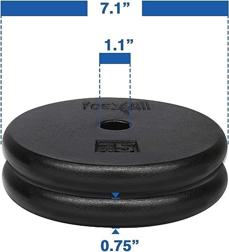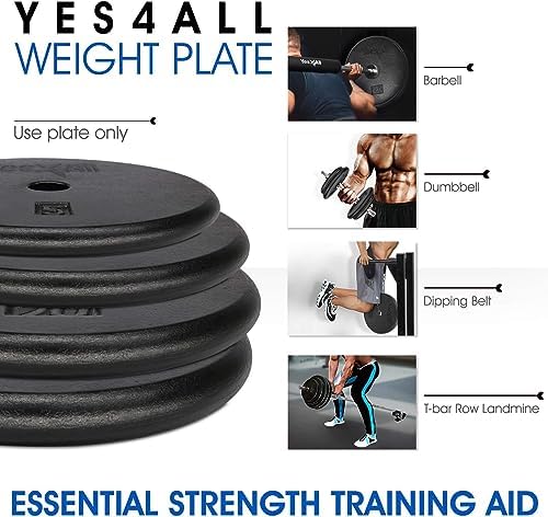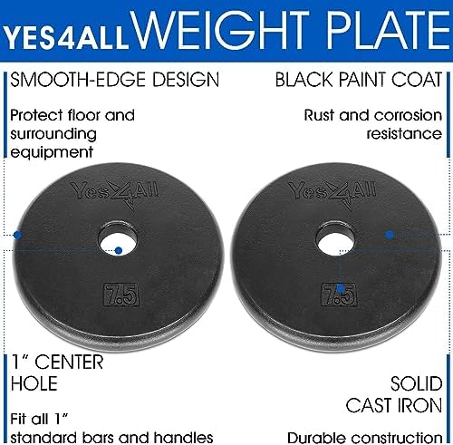 MUST-HAVE FOR MUSCLE STRENGTH AND DEFINITION: Work and strengthen your muscles more effectively including biceps, chest, shoulders, legs & more    1” CENTER HOLE WITH SOLID CAST IRON CONSTRUCTION: Fit most 1-inch standard bars & dumbbell handles. Highly tough and durable for a wide range of resistance exercises as biceps curl, triceps extension, chest fly, or shoulder press.    DURABLE BLACK PAINT COATING: Semi-gloss black paint finish prevents the plates from rust and corrosion without any unpleasant odor.    6 WEIGHTS AVAILABLE (SOLD IN PAIR): 5 lbs, 7.5 lbs, 10 lbs, 15 lbs, 20 lbs, 25 lbs - Suitable for all strength levels and workout intensities.    FUNCTIONAL & CONVENIENT DESIGN: Yes4All Weight Plates features great design that makes moving, loading and storage become effortless. You can easily use them for your exercise routine