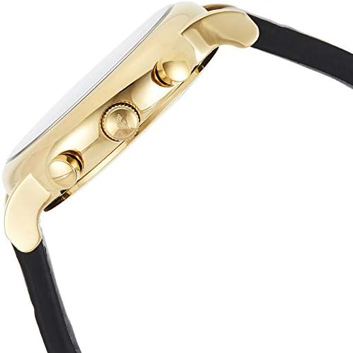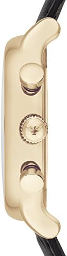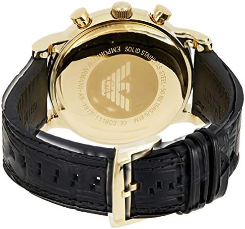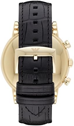 Gold-tone watch featuring round black dial with three-hand movement, logo emblem at 3 o'clock, three-eye chronograph at center 46 mm stainless steel case with mineral dial window Quartz movement with analog display Leather band with buckle closure Water resistant to 50 m (165 ft): In general, suitable for short periods of recreational swimming, but not diving or snorkeling         #252,864 in Clothing, Shoes & Jewelry ( )   #1,162 in