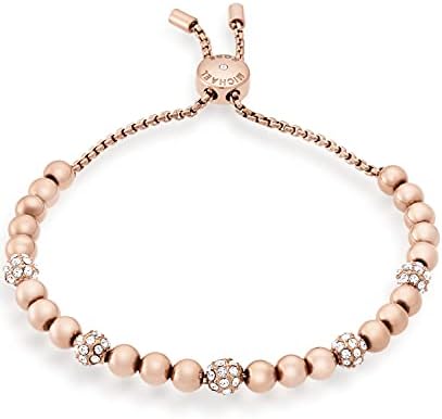 The Michael Kors jewelry collection is designed for timeless appeal. Crafted from hypoallergenic materials like stainless steel and brass with sparkling accents, rich in detail with enduring quality. Be charmingly chic in this rose gold-tone Michael Kors Jewelry beaded bracelet. Four pavé crystal beads add sparkle, and the slider clasp is finished with the MK logo. This beaded bracelet features gold-tone stainless steel and an adjustable slider closure. Circumference 7" Closure Type: Slider Finish: Polished         #306,643 in Clothing, Shoes & Jewelry ( )   #760 in