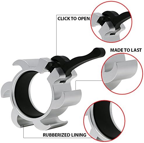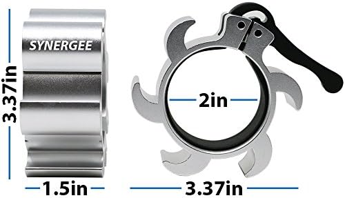 ★ STELLAR GRIP ★ - Our Barbell Collars fit securely around a standard 2” diameter Olympic barbell to provide a resilient, won’t-let-up grip to keep your bumper plates in place – no matter how many you have on the bar!    ★ HIGH QUALITY CONSTRUCTION ★ – These Collars are made from durable and lightweight aluminum. Unlike plastic competitors, our collars have a rubberized lining to ensure a strong hold and protect the bar. This grip pad runs the circumference of the bar to provide even, locked-in support.    ★ EFFORTLESS TO USE ★ – Our lock and release design is simple and solid. We made our collars easy to use to ensure you waste no time during your training. Quickly change the plates on your barbell to maximize gains. The collars are lightweight and transportable, so you can bring your personal, head-turning collars wherever you workout!    ★ WHAT’S IN THE PACKAGE ★ – This package comes comes with (2) 2-inch in diameter, fine-looking, quick-release collars in Silver.    ★ NO SWEAT ★ – Leave the sweating and swearing for your training! Buying from Synergee means quick and caring customer service! Customer Satisfaction is our Number 1 Goal!
