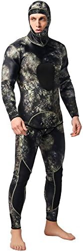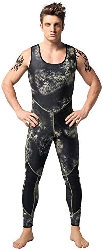 neoprene Import Neoprene: warm, breathable and quick-drying, help to improve the swimming speed and reduce drag of the water. Split Two-piece Design: Wetsuit top with diving hood and wetsuit vest pants as the picture shows, chest and knee pad design, make the diving movement more secure, enjoyable. Warmth and Protection: 3mm neoprene camouflage diving suit provides ample thermal protection and defense against sea lice, jellies and other biological irritants Perfect for all water sports like diving, spearfishing, scuba diving, swimming, surfing, stand-up paddle boarding, wave surfing, kayaking, canoeing, bodyboarding, wakeboarding, windsurfing. WARM TIPS: We have improved the wetsuit size based on customers’ feedbacks, and the size chart is update, please choose the right size according to the size table. Due to the manual measurement, spearfishing Wetsuit size exits ±2cm.