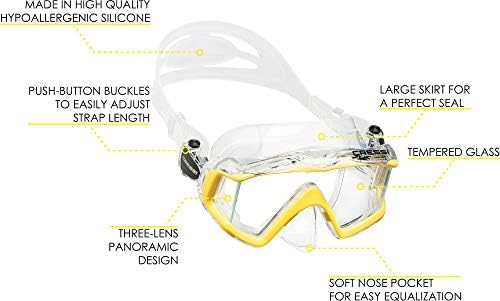 A great equipment ready to use to enjoy snorkeling or scuba diving without any trouble.    The panoramic masks have been designed to give you great visibility, fit, durability, and comfort.    Mask made of hypoallergenic soft silicone to ensure a perfect sealing. Soft nose pocket for easy equalization. Lenses in tempered glass for safety and easy-to-clean. Push-button buckles to easily adjust strap length.    The Supernova Dry is the first submersible dry top snorkel of Cressi. Great for youth to adults, anyone who wants to feel that much safer when they are snorkeling.    The dry top valve eliminates water entry when submerged. A soft silicone mouthpiece reduced drastically jaw fatigue. Bottom purge valve to blow out the remaining water.    The Pano 3 & Supernova Dry is designed in Italy by Cressi and made in Taiwan. Cressi has been an Italian brand pioneer in scuba diving, snorkeling, and swimming equipment since 1946.