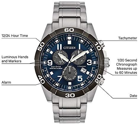 Men's luxury timepieces with technical advancements and a sporty style An Eco-Friendly Evolution: Citizen launches first Titanium Watch in 1970. More than 50-year-old evolution of innovative timepieces crafted from proprietary space-age material. Benefits of Super Titanium: Lightweight for Better Comfort, Scratch Resistant, Gentle on Skin, and Rust Resistant. Five times harder and 40% lighter than stainless steel. 1/20 Second Chronograph Measures up to 60 Minutes, Perpetual Calendar, Dual Time (Second Time Zone), 12/24 Hour Time, Alarm, Date Sustainably powered by any light, with our Eco-Drive technology this watch never needs a battery. 100 Meters Water Resistant and 5 Year Limited Warranty         #321,980 in Clothing, Shoes & Jewelry ( )   #1,612 in