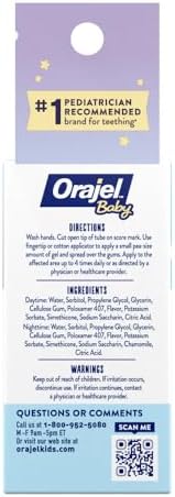 HELPS CALM, RELAX AND SOOTHE: Our instant cooling sensation works wonders on infants who may be teething, upset, cranky or fussy – day or night.    DRUG-FREE: Free from benzocaine, belladonna, eugenol, sugar, menthol, sodium lauryl sulfate (SLS), sulfate, dairy, and artificial colors, dyes, and sweeteners.    SAFE AND GENTLE FORMULA: Both our daytime and nighttime cooling gels are easy-to-use at home or away.    #1 PEDIATRICIAN RECOMMENDED: Trust the professionals who trust Orajel Baby.    STAGE 1 FOR AGES 0+: Orajel Kids Stage 1 Teething and Tooth & Gum Cleanser products are appropriate for ages 0 and up.           #297 in Baby ( )   #3 in