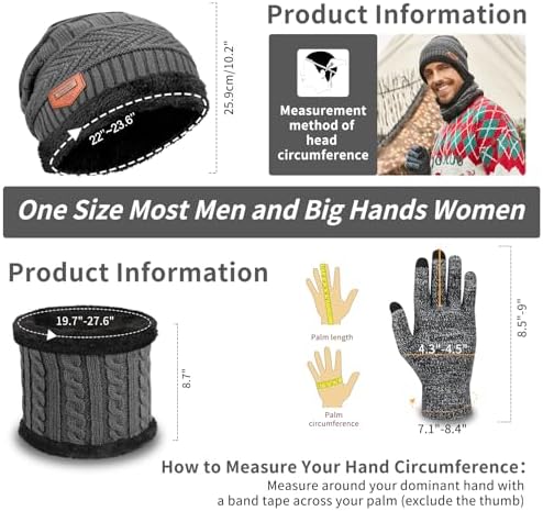 「3 in 1 Hat Scarf and Glove Set」: You will get 1 * Knit Beanie Hat + 1 * Neck Warmer + 1 Pair * Anti-slip Touchscreen Gloves to help you get through the cold winter. 「Touchscreen Gloves」: Three Conductive Fingertips to make sure the sensitive response to the smartphone or tablet screen. Enjoy the cellphone with our warm touch screen gloves on. (ATTENTION: Please make sure you have worn to the top of 3 touch screen fingers to enable the touchscreen capability effective, Otherwise it might be incontinuous.) 「Thick Double Layer」: Stretchy chunky cable knitting yarn with soft fluffy fleece lining layer, keep you warm and cozy in the snow, stop the cold wind in. Versatile for daily casual wear, skiing, snowboarding and other cold weather occasions. 「Classic Never Goes Out Of Style」: Must-have plain winter accessories for your wardrobe to match all kinds of jackets, coats or parka no matter you are a woman or a man. Also a great choice as a sweet gift for Birthday, Christmas or New Year. 「Free Size and Unisex」: Great stretch. One size fits most men women guys ladies teens. Hat Circumference: 22"-23.6", Height: 10.2". Circle Scarf Circumference: 19.7"-27.6", Height: 8.7". Total Length of Gloves: 8.5"-9", Hand Circumference: 7.1"-8.4" #98,880 in Clothing, Shoes & Jewelry ( ) #137 in