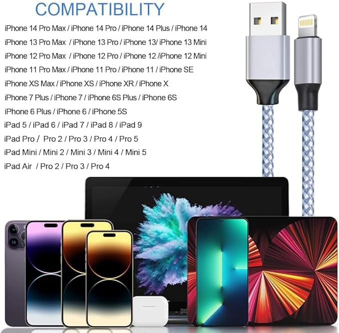 [MFi Certification]Best New Nylon Braided materials and cutting-edge technology ensure a maximum charging speed of up to 2.1A, which is faster than most standard cables. The professional research and development team enables each cable to exceed other people's products in terms of safety during charging. Ultrathin connector heads can be inserted into almost all shell openings.    Precise interface design: The nylon braided sheath can protect the cable from knotting and abrasion. Our charger cable has been tested and can be bent 95 degrees and 8000 times. The exquisite metal connector shell head increases the service life and avoids the risk of cracking or other types of fracture.    High-quality copper wires can maximize signal quality and increase durability. Sync and charge quickly on the device. Our technical team has conducted thousands of tests to ensure the safety of the durable 8-pin high-speed braided USB sync and charging cable    Super compatibility: iPhone 14/13/12/11,14/13/12/11 Pro,14/13/12/11 Pro Max,13/12 Mini, XS MAX, XS, XR, X, 8, 8Plus, 7, 7Plus, 6Plus, 6s Plus, 6s, 6, iPad Air,Air 2, iPad mini,mini 2, mini3, iPad,Airpods,iPod Touch 5th Gen,iPod Nano 7th Gen. Compatible with all operating system devices.    High-quality service: All 3 cables have been 100% tested, our team will provide each customer with high-quality service, so that you can buy and use with confidence.