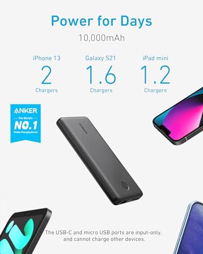 Quality Throughout:Built adventure-tier touch with superior durability and scratch resistance, PowerCore Slim 10000 is premium both inside and out.    Slim Size, Big Power:One of the slimmest and lightest 10,000mAh portable chargers on the market. Provides 2.25 charges for iPhone 12, 1.6 charges for Galaxy S20 and 1.2 charges for iPad mini 5.The two input ports may not be used at the same time. The USB-C input port has no output function.    Versatile Charging: Anker's exclusive PowerIQ and VoltageBoost technology combine to detect and deliver a tailored charge up to 12W, while the trickle-charging mode is the best way to charge low-power devices.    Superior Safety:Anker’s comprehensive MultiProtect safety system includes overcharge protection, short circuit protection, temperature control, and more.    What You Get: PowerCore Slim 10000 portable charger, Micro USB cable (to charge the power bank, USB-C cable and Lightning cable not included), welcome guide, 18-month warranty, and friendly customer service
