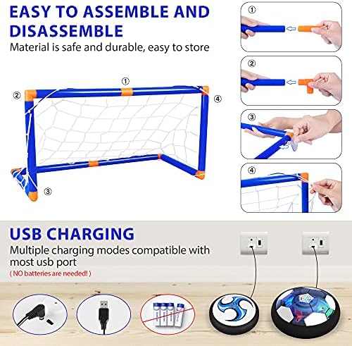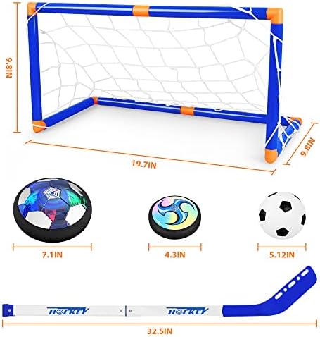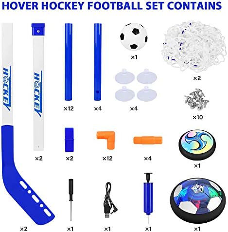 Valuable Hover Hockey Set for Kids: Includes 2 rechargeable hover soccer balls, no need batteries,1 inflatable soccer and 1 inflatable basketball, inflate the ball with the pump,2 hockey sticks, 2 goals and 1 rechargeable cable, a Mini Screwdriver    Special Design and Easy to Assemble: The hover ball has multi-color LED lights built in, which can enhance the feeling of fun, This brilliant light can easily grab children's attention and keep them occupied for hours.    Multiplayer Game and Enhance the Relationship: Powerful fan floats allow the ball can slide on any flat floor perfectly, including hardwood floors, tile floors, basements, and even low-pile carpets, Kids can not only play with hockey toys but also play them as ice hockey, knee basketball set, soccer hover ball, soccer toys, Kids can also compete with friends and parents to enhance the relationship.    Ideal gift: Color packaging, Develop sports skills, collaborative games and social skills, rovide time for enjoyment and exercise for kids.The best choice for children's birthday gifts or Christmas gifts.Suitable indoors or outdoors, perfect for children to enjoy the perfect holiday.    ⚽? The hover soccer set for kids allows kids to play in various ways as it glides perfectly on any smooth surface. Kids can play them as hockey toys, soccer hover balls, soccer games, and bowling ball games. In twos or as a multiplayer practice kickback toy with their dog. Excellent soccer games for toddlers 3,4,5,6,7,8 etc
