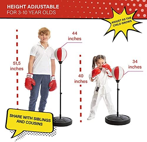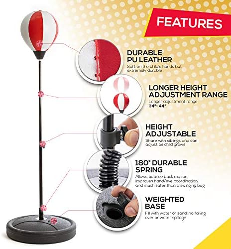 TAKES A SOLID PUNCH: Kids will go crazy over this boxing set! For starters, it’s the ONLY kids punching bag you’ve seen today in fun American boxing colors! It’s a tough freestanding punching bag too! This inflatable bag is made of PU leather and takes everything a kid can dish out! And it keeps bouncing back, ready for more! Also comes with cool kids boxing gloves!    HOURS OF HEALTHY FUN: Growing kids are full of energy - and that energy has to go somewhere. This red and white punching bag with stand is modelled on pro boxing equipment, so even if it’s hard for you to get them into sports or outdoor toys, this is different! Wait for it… because they’ll be begging you DAILY to put on their punching mitts and wear themselves out!    THE GIFT THAT NEVER WEARS OUT: Birthdays, Christmas – this set covers kids gifts for all ages and occasions! Whether you’re looking for 4 year old boy gifts, girls toys, or toys for 7 year old boys, this SUPER COOL boxing ball set will be the most addictive toy in the house! Look out, even Grandma is likely to try and throw in a few rounds! This kit is designed for kids aged 3 to 10yrs.    EASY TO USE: This standing punching bag comes with a FREE pump and 6 ounce boxing gloves for kids. Perfect kids boxing training equipment! The Bullseye Boxing Kit comes with full instructions so it’s easy to set up. It has an adjustable height from 34” to 44” and the round base is solid with a carry handle for transporting around. Made from Non-Toxic, robust PU Leather.    OUR PROMISE: We understand a kids boxing gloves and punching bag set is quite a big commitment. Especially for children who may have never had one before! But we’ve got you covered, if you have any issues contact us and we promise to take care of it! So why not try the portable Bulleseye inflatable punching bag set today, risk free.