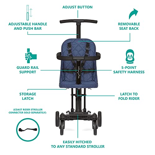 Polyester    Imported    EXPERIENCE THE WORLD: The Parent-approved Coast Rider Stroller effortlessly converts from Stroller to Scooter & Rider, offering your child a 275-degree viewing! Meeting all Disney & theme park size specs with plush seating, make this award-winner a part of all family outings.    BYE-BYE BULK: Super lightweight at just 13.5 Lbs, its aluminium frame & soft-ride wheels makes manoeuvrability a breeze. Combined with the easy one-hand fold feature that allows it to fold inward like a book in an instant, it’s a parent-loved choice.    PARENT-CONCIOUS: The innovation-driven Coast Rider Stroller comes with adjustable handles & push bars, and water-proof fabric. It can also be combined with the Coast Rider Stroller Canopy & Connector (both sold separately) for on-the-go fun time. Available in 5 finishes.    THE SAFEST CHOICE: This stroller comes a 5-point safety harness, & meets/exceeds all CPSC & ASTM standards. Winner of the 2020 JPMA Innovation Awards, 2020 National Parenting Product Awards & 2020 Baby Maternity Magazine Product of the Year Award.    WARNINGS: Weight limit: 45 Lbs. Dimensions: 28” L x 14” W x 37.5” H. Additional weight on handles could tip the stroller or the child can get entangled by a strap causing suffocation or injury. Please follow all safety protocols.