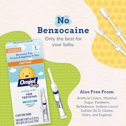 HELPS CALM, RELAX, AND SOOTHE: Our instant cooling sensation works wonders on infants who may be teething, upset, cranky, or fussy    DRUG-FREE: Free from benzocaine, belladonna, eugenol, sugar, menthol, sodium lauryl sulfate (SLS), sulfate, dairy, and artificial colors and dyes    CONVENIENT: 12 easy to use single-use swabs    #1 PEDIATRICIAN RECOMMENDED: Trust the professionals who trust Orajel Baby    STAGE 1 FOR AGES 0+: Orajel Kids Stage 1 Teething and Tooth & Gum Cleanser products are appropriate for ages 0 and up