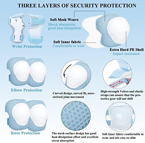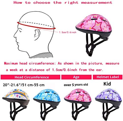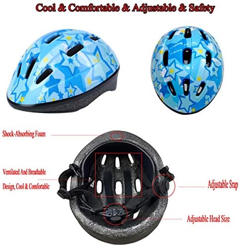【Safety Impact Resistance】: Kids skateboard helmet adopt ABS outer shell and high-density EPS inner shell with thickened soft sponge inside, sturdy ABS shell resists impact, the EPS foam which helps absorb impact and protect the head during impact. Our goal is keep children away from injured when they are enjoying sports.    【Adjustable Design】: Kids skate helmet suitable for ages 3-8 years old boys and girls with helmet size 20”-21.6”/51 cm-55 cm. Toddler helmets come with an adjustable helmet turning knob and adjustable straps, can be flexibly adjusted to the size suitable for children. Helmet vents and foam keep kids cool, comfortable and reduce sweating when they during sport movement.    【Multifunctional Protective Sports Gear】: The kids bike helmet and knee pads elbow pads wrist guards are designed for kids sports safety protection, the tough pads with Velcro adjustable straps which can be flexibly adjusted to fit the child comfortable to wear. Protective gear set provides comprehensive safety protection for children.    【Suitable for Multiple Sports】: Our kids bicycle helmets can protect the safety of children, provide protection for many Outdoor Activities, such as bike riding cycling, roller skating, skateboard accessories, scooter, Street dance, pedal and more.    【Creative Gifts for Children】: Toddler helmet are very lightweight, and kids won’t feel tired after hours of wearing without sacrificing safety. The helmet is sturdy and durable that children can use it for a long time. It is a good choice as a gift for Children's Day, Christmas, Halloween, Thanksgiving, birthday and other festivals.