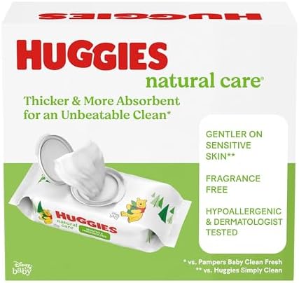 6 flip-top packs of 48 Huggies Natural Care Sensitive Baby Wipes, Unscented (288 wipes total)    Accepted by the National Eczema Association: These unscented baby wipes are accepted by the National Eczema Association and are safe for sensitive skin    Plant-Based Wipes Since 1990* (*70%+ by weight plant-based materials): Huggies Natural Care Sensitive Baby Wipes are plant-based and made with 99% purified water for a gentle clean    Safe for Sensitive Skin: Hypoallergenic and dermatologist tested, unscented diaper wipes are infused with aloe and vitamin E    Natural Care Sensitive diaper wipes are pH balanced to help maintain healthy skin    No Harsh Ingredients: Our sensitive baby wipes are free of lotions, fragrances, parabens, alcohol, dyes and elemental chlorine; does not contain phenoxyethanol or MIT    EZ Pull 1-Handed Dispensing: One-handed dispensing makes it easy to grab baby wipes without wasting sheets           #2 in Baby ( )   #1 in