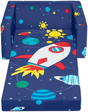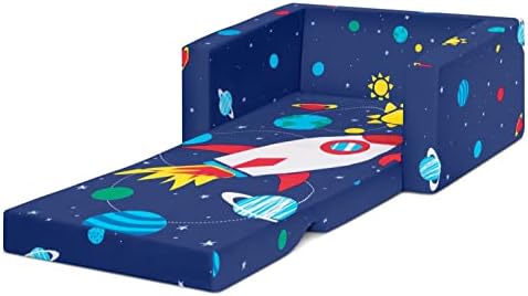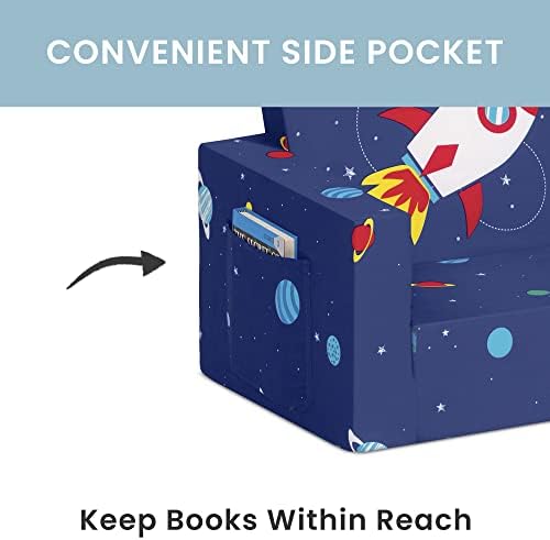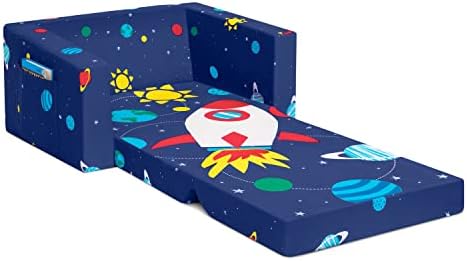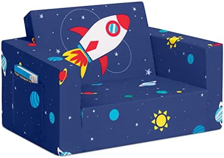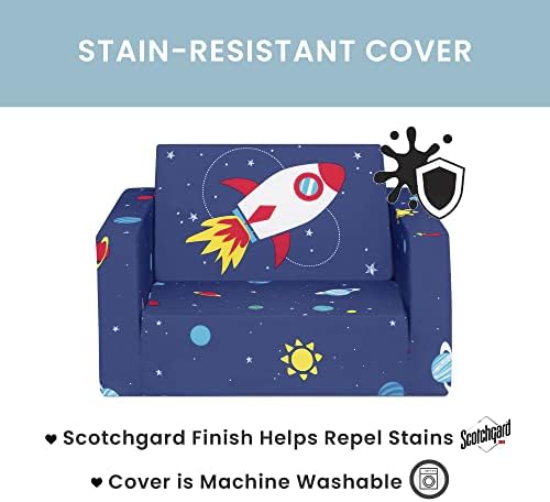 CONVERTIBLE 2-IN-1 DESIGN: This flip-open chair converts to a lounger/sleeper| Ideal for reading, relaxing, playing or sleeping, your child will enjoy this chair with siblings/friends | Recommended for ages 18 months+ | Fits 1 to 2 small children    COMFY FOAM CONSTRUCTION: Supportive foam keeps its shape and provides all-day comfort | Soft and durable slipcover features side pocket to keep books/tablet within reach | Lightweight chair is portable, great for bedrooms, playrooms, gaming or studying    STAIN-RESISTANT: Keep chair looking new with the built-in Scotchgard stain release finish that helps most stains wash out during normal laundering | Chair features a machine-washable slipcover that zips off    STAIN-RESISTANT: Keep chair looking new with the built-in Scotchgard stain release finish that helps most stains wash out during normal laundering | Chair features a machine-washable slipcover that zips off    EASY TO UNBOX: Chair ships in super-small box | Once unboxed chair expands 5x (may take 24 hours to fully expand) | Sofa size: 23”W x 17”D x 15”H| Lounger size when flipped open: 17.5”W x 37.5”D x 15”H