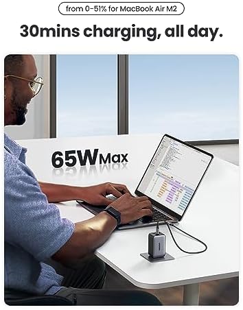 65W High Speed Single Port Charger: Connect a single USB C device to get a 65W max charge; Charge the MacBook Air M2 to 51% in 30 Minutes    One Charger, More Devices: Ugreen's 65W USB C charger provides an enormous 65W of charging power; enough to fast charge phones, tablets, and laptops; All from a single charger    Travel Friendly, Compact Design: Thanks to a cutting edge GaN chip, Ugreen's 65W USB C charger is 50% smaller than the original 61W USB C charger; A foldable plug provides more portability and a better travel experience    Power Dispenser System: An intelligent system that reallocates power to protect and extend your device’s health    Wide Compatibility: Broad support for multiple devices, MacBook Pro 16, MacBook Air M2 2022, MacBook Pro 13'' M2, iPad Pro, iPhone 15 Pro 14 13, Galaxy S24 Ultra S23, Switch, Steam Deck, and More