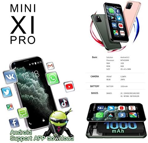 COOL MiNi SMART PHONE with such a Cute iPhone 11 Pro Max Look alike Design and a Mini 2.5 inch Little TouchScreen. Use it like any other Android mobile, You Can Browse the Internet anywhere and use Google Play Store to Download apps at the Palm of your Hand.    THIS PHONE IS UNLOCKED it will be compatible with all 2G and 3G network in US. This may include Cricket, Straight Talk, NET10, MetroPCS, Simple Mobile, Google Project Fi, T-mobile, VERIZON, AT&T and more. Check Your Network Compatibility FOR 3G WCDMA 850/2100MHz , 2G GSM 850/900/1800/1900MHz.    TINY DEVICE, MANY FEATURES! With Bluetooth, Wi-Fi and SIM Connectivity The little Smart Phone supports Voice Calling, Video Calls, Camera, Sound Record, Email, MP3 Playback, GPRS, FM Radio, Touchscreen, GPS Navigation, Message, SMS, MMS, Video Player, Memory Card Slots,Internet Browser. Use The GOOGLE PLAY STORE & Download your Favorite Apps: Facebook, Youtube, Twitter, Whatsapp, Chrome, Waze, Instagram and many more...    FAST STRONG AND DURABLE With MTK Quad CPU, 1GB Of RAM, 8GB of Storage. Strong durable body With a Great but Small iPhone 11pro / XI Pro Max Design!    CONNECT ANYWHERE GLOBAL UNLOCKED with Wifi, Bluetooth and GPS Navigation You can Connect anywhere Enjoy a Simple life With a Small portable SmartPhone. Check Your Network Band for GSM or WCDMA. Do Not Buy Before Checking Band Compatibility!    USE IT LIKE ANY OTHER ANDROID SMARTPHONE !!! Download your Apps via The Google Play Store. Smart & Small. Children Just Love It!!!    BEST BACKUP PHONE, POCKET SMARTPHONE - Improved 1000mAh Battery!!! Awesome Nice Gift! Portable and Great for Travel!!! Dual Camera: front (with Beautifying), Rear Back . Dual Sim dual standby.    MINI CUTE PHONE. Super small just like a bank card. Mini iPhone 11 Pro Look's and Feeling! XI Pro / Pro Max.