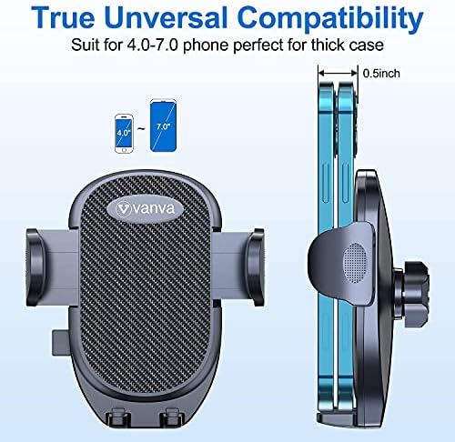 [ vanva Ultimate Car Phone Holder ] With the latest improved vent clip [Don't Slip & Drop], this car phone holder could hold your phone firmly even on the bumpiest road or sharper turn. This phone car holder is made from the most advanced durable sturdy aviation-grade materials,it is the first phone mount car to pass most extreme test on the market, making it more resistant to abrasion and corrosion.    [ Screw the Vent Clamp Tightly & Secure Stable Install ] vanva car phone mount adopts the latest screw mechanial lock design which holds your phone securely to the vent. Screw the clamp and the rubber clip hook will catch one of the car air vent blades tightly, even if you hit a bump or a sharper turn. After take few seconds to install it well, which won't distract you from driving.    [ Rotate Freely & Adjust Perfect Angle as You Like] Dual to the 360-degree swivel head, your phone can be rotated easily to landscape and poraits as well as anywhere in between, with the vanva car mount. This air vent car mount allow you secure your smartphone to the air vent firmly, keeping it in place whilst the optimal viewing angle. Easily lay and remove your phone using the widely comfortable phone cradle with instant release button.    [ Hold Your Phone Stably & Drive without Distracting ] vanva phone mount holder has anti-slip rubber pads, stable support shelf, firm & scratch-free claw offer secure grip for your cellphone to ensure safer driving. With all above these, the stability increase 5 times, even can stable support big phones and thick cases.    [ Fit Universally & Get 24 Months Worry Free Warranty ] You'll enjoy 24 months warranty. This cell phone car mount is fit foriPhone 15/ 15 plus/ 15 Pro/ 15 Pro Max/iPhone 14/ 14 plus/ 14 Pro/ 14 Pro Max /13/ 13 Pro / 13 Pro Max/ 12/12 Pro/12 Pro Max/12 Mini/SE/ 11 /11 Pro /11 Pro Max /XS / XR / XS Max / X / 8 / 8 Plus / 7 / 7 Plus / SE / 6s / 6 Plus / 6 / 5s / 5, Samsung Galaxy S10 / S10+ / S10e / S9 / S9+ / S8 / S8+ /Note 10+ /Note 10 / Note 9/Note 8/ S7 / S7 Edge etc.
