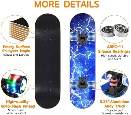 PRESENT✔ Tool T-handle*1 pc , Backup Bearing* 2 pcs    STURDY AND SAFE✔ The skateboard is composed of 9-Ply Canadian Maple Wood, strong and durable to withstand riders up to 220lbs. It's equipped with Heavy-Duty Aluminum Alloy Trucks, making them reliable and sturdy, safe for beginners and expert riders. 31" length x 8'' wide, can make enough space for your feet at the top of the deck, you can easily ride, control and carry it around.    SMOOTH✔ Anti-shock 6045 blue High Rebound PU wheels with ABEC-11 precision bearings, great fit for all kinds of tricks and cruising in different street surface, skate parks, ramps, pools and no matter the play ground,it works perfectly on all surfaces.    PU FLASHING WHEELS✔ The skateboard is with PU flashing wheels (will light up when you use ) make you safe when you ride in dark place and 8”wide non-slip emery deck can not only provide more stability and safety for users but also hold both foot on it, it is safe for all levels of riders.    EASY TO STOP✔ When you want stop , just put one of your foot on the ground to stop it. Or you can lean your body to reverse direction to slow down the speed then stop your skateboard.